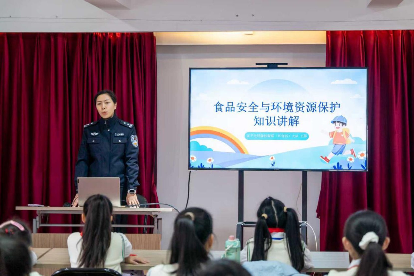 活动伊始,森警大队民警王郡从环境的构成要素有哪些、与人类的生产生活有哪些密切联系、环境和野生动植物资源被破坏的危害、在生活中如何保护生态资源等方面话题,给在场的“红领巾”讲解员们上了一堂有趣的生态普法课程。