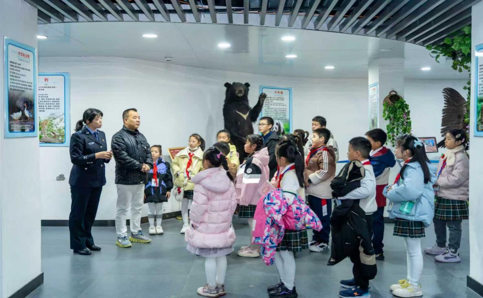 课程结束后,“红领巾”讲解员们来到了九峰山动物园生态保护宣教基地的生态建设、生态普法、动物标本、植物标本等几大区域进行公益讲解。别看他们是第一次在这里上岗,可是提前做足了功课,讲解员们从科普馆里的动植物标本形态特征、生活习性、栖息环境等知识,都有着详细了解。