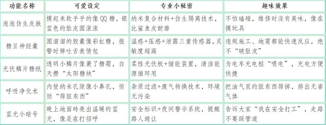 “泡泡龙”最得意的是它的“光伏鳞片糖纸”:管道外壁贴满透明小鳞片,白天吸太阳能像攒糖块,一半给自己的传感器当“零食”,另一半偷偷通过地下电缆,把电“喂”给路边的充电桩——妈妈说,她上周开电动车充电,用的就是“泡泡龙”攒的电!一到晚上,它还会让头顶的地面砖亮起软乎乎的蓝光,像在说:“我在这儿安全打工哦!千万不要打扰到我哦!”