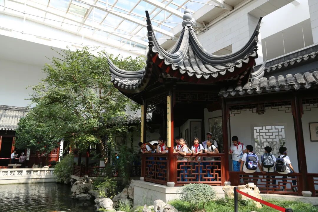 随后队员们乘车前往中国园林博物馆,探寻“先辈守护的是怎样的土地”这一核心问题。刚入馆,圆明园全景巨型雕塑便让同学们惊叹于中华大地的园林瑰宝,直观感受“文化沃土”的厚重。在辅导员引导下,大家穿梭于苏州畅园的精巧雅致、岭南余荫山房的独特风情间,在“中国古代园林厅”追溯造园历史,在“园林文化厅”解读人与自然和谐共生的智慧。