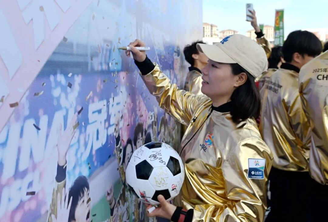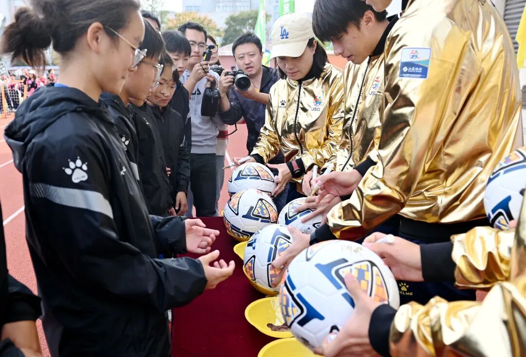 随后的赠球仪式,将活动推向了高潮。冠军队员们拿起签字笔,郑重地在每一颗足球上签下自己的名字。每一颗签名足球,都承载着足球英雄在“苏超”赛场逆风翻盘的拼搏故事,也寄托着足球英雄对队员坚守热爱、无畏向前的期许。当这些珍贵的签名足球被交到小队员手中时,传递的不仅是一份纪念,更是一份沉甸甸的期许和强大的精神动力,激励着每一位实验学校队员为热爱全力以赴,为梦想无畏向前。