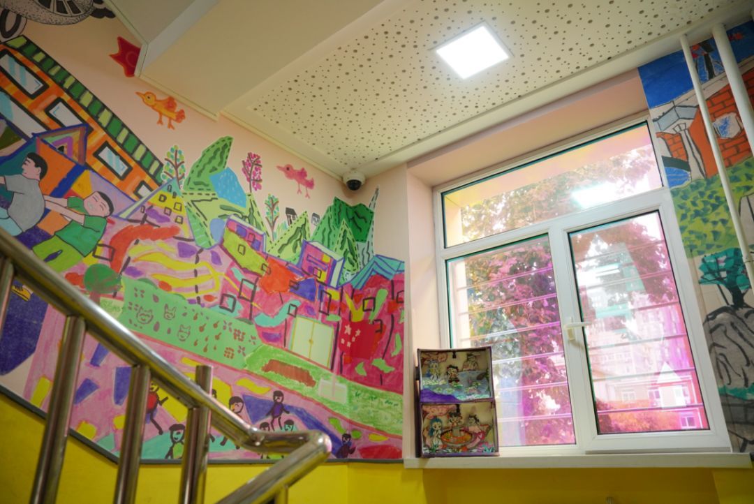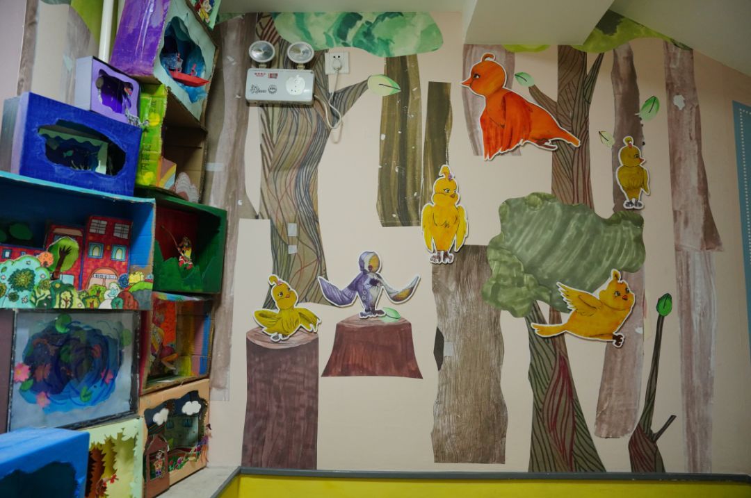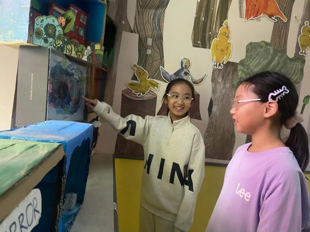 美术馆的指导老师们从孩子们充满童真与想象力的画作中,提炼出色彩、线条、图形等核心艺术元素,并以此为“基因”,运用现代拼贴艺术手法,为我校精心设计并绘制了一面极具视觉冲击力的楼道墙绘和搭建了立体空间作品。