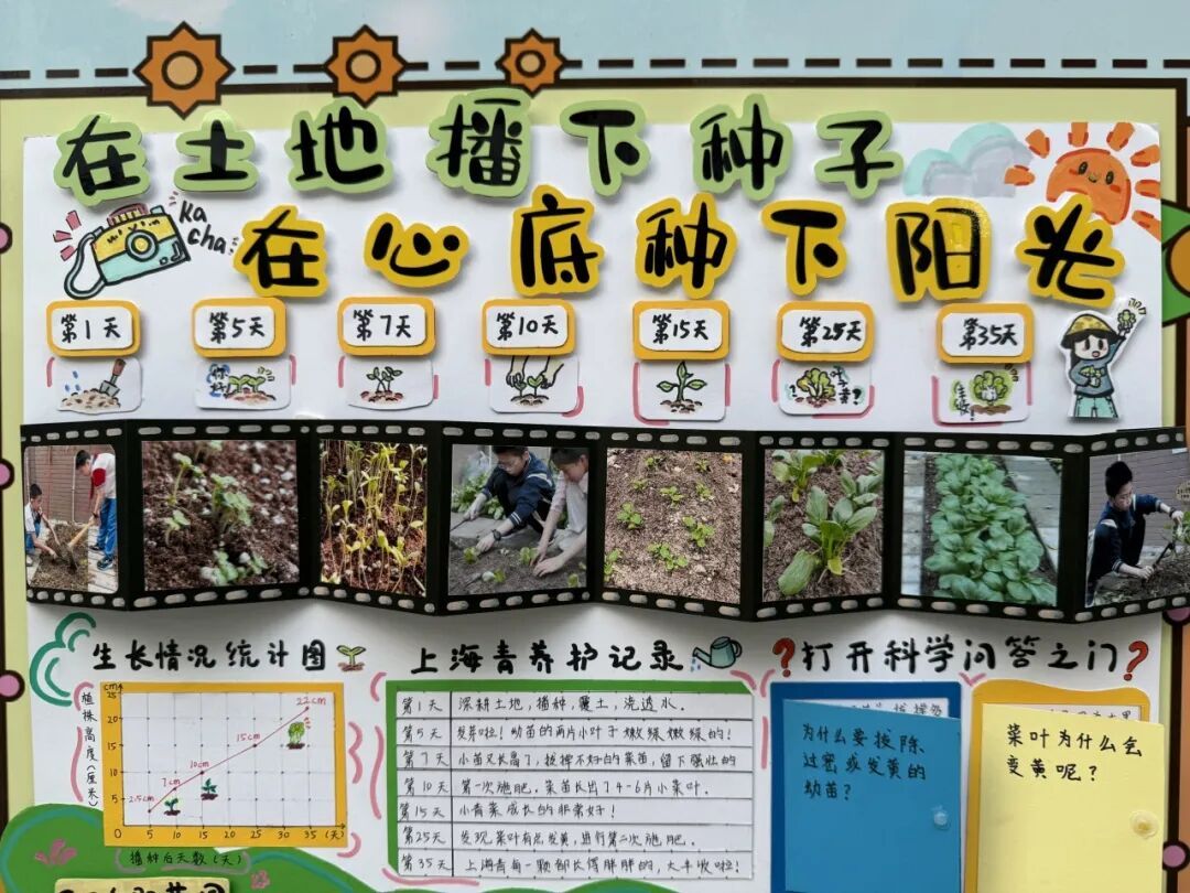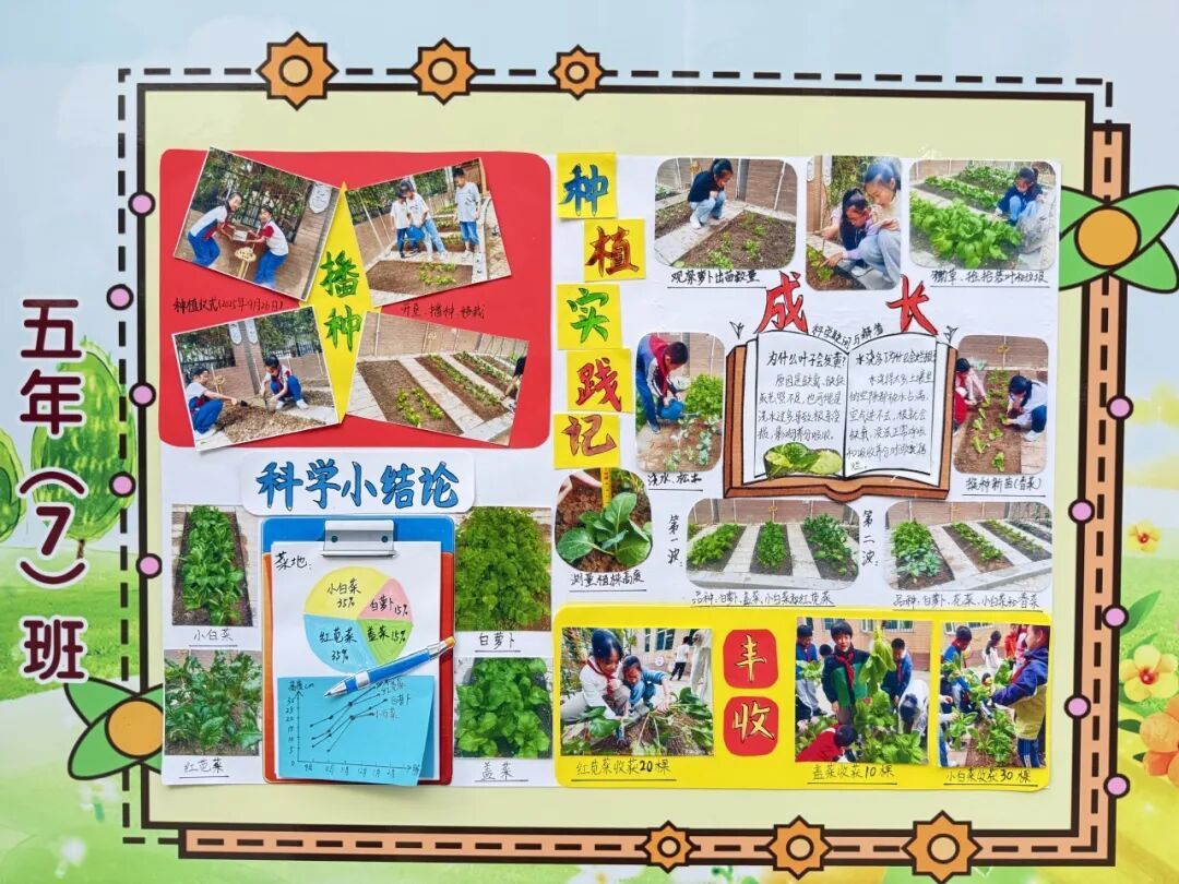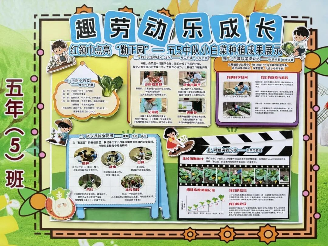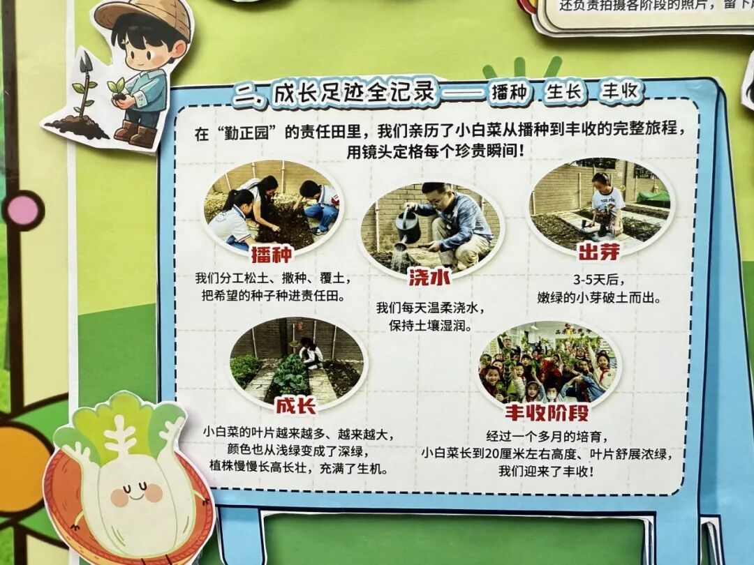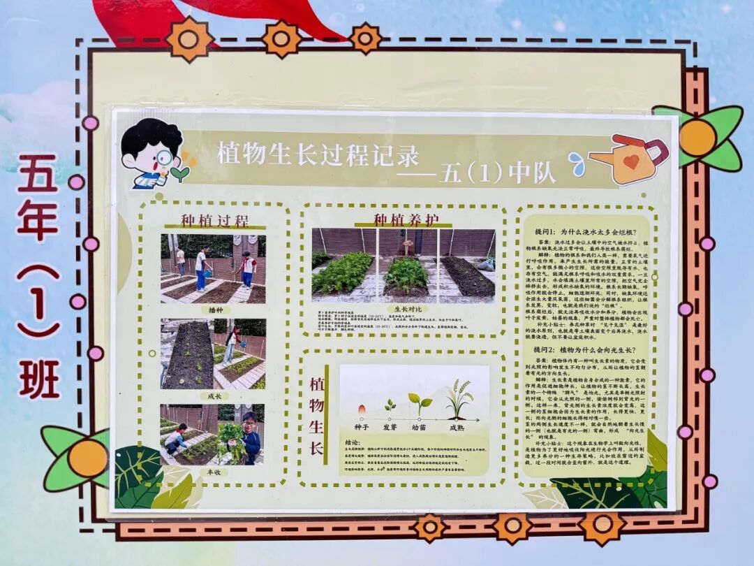 本次成果展的核心亮点,当属各班精彩纷呈的主题展板,将劳动实践与科学探究深度融合,让成长型思维在劳动中落地生根。展板以“播种—成长—丰收”为主线,串联起劳动全程的珍贵影像,更藏着同学们化身“小小科学家”的探索之旅。