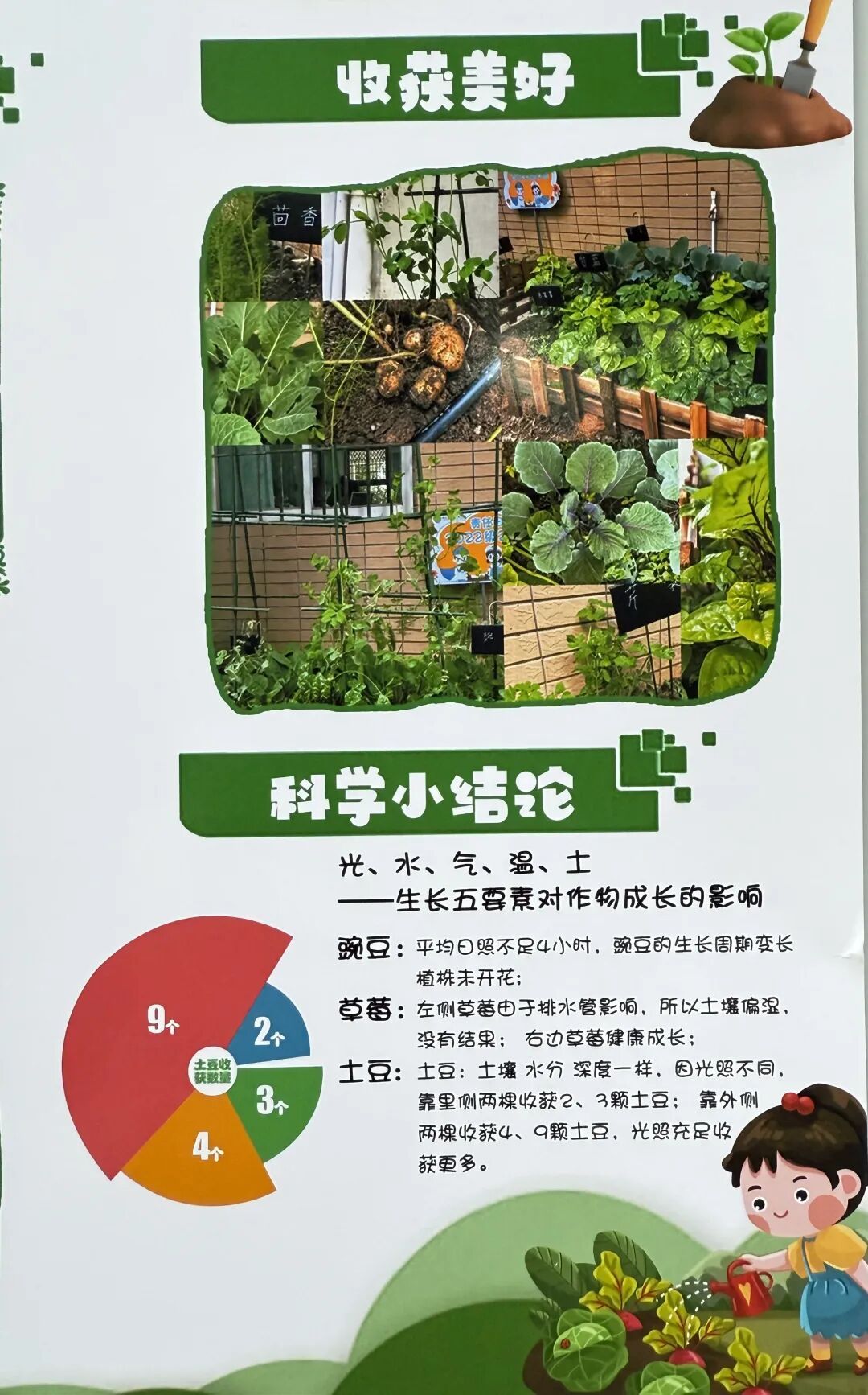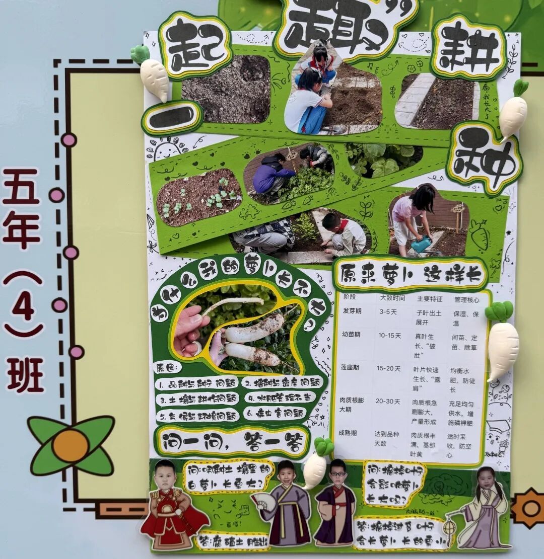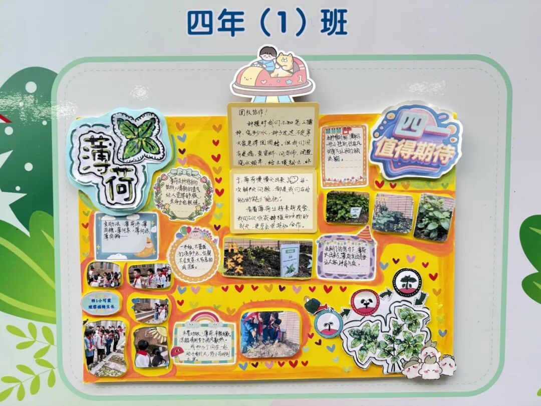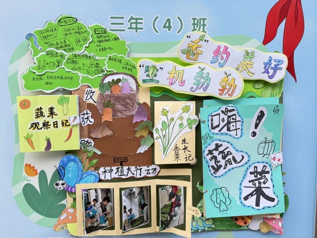 本次成果展的核心亮点,当属各班精彩纷呈的主题展板,将劳动实践与科学探究深度融合,让成长型思维在劳动中落地生根。展板以“播种—成长—丰收”为主线,串联起劳动全程的珍贵影像,更藏着同学们化身“小小科学家”的探索之旅。