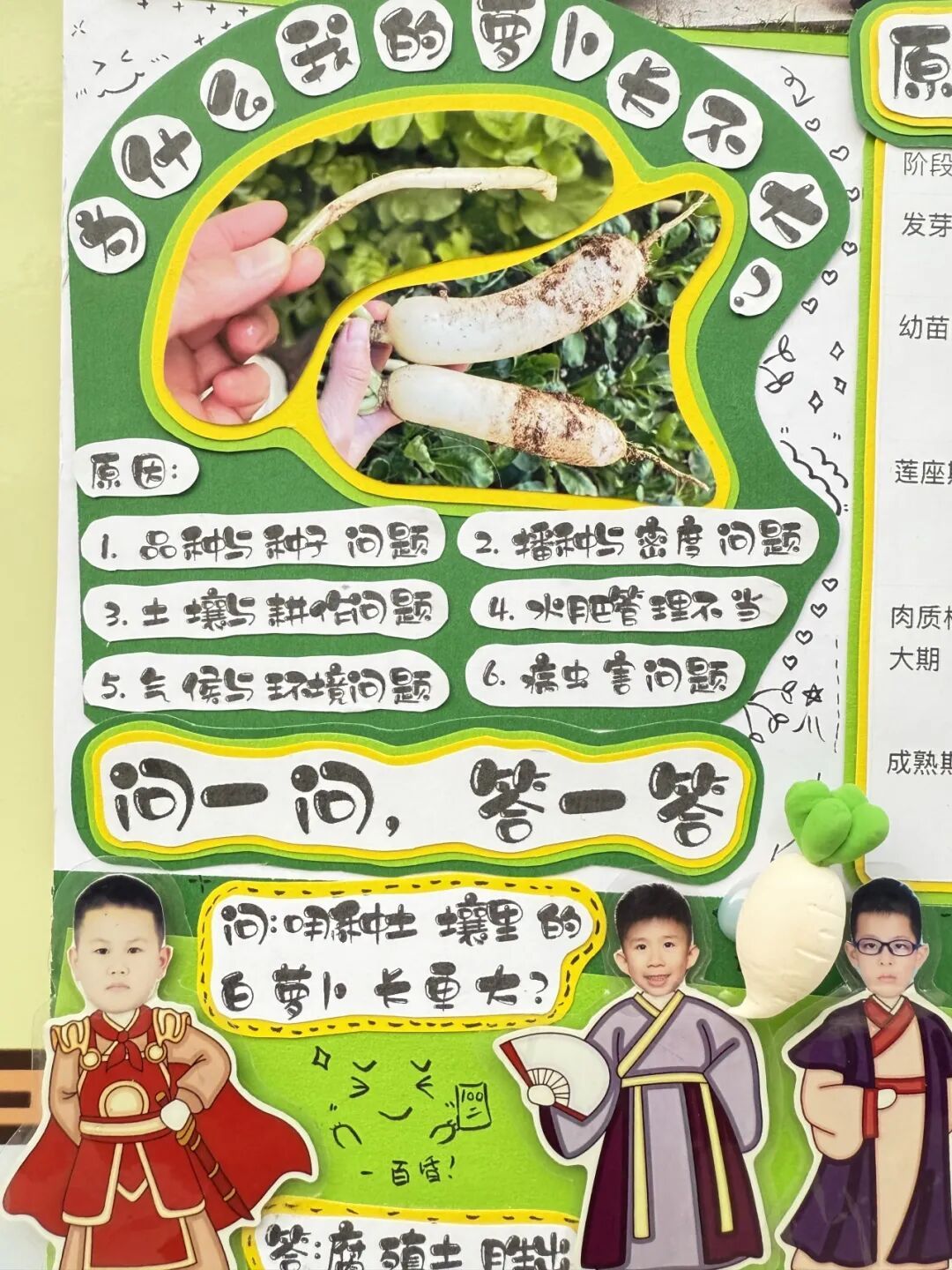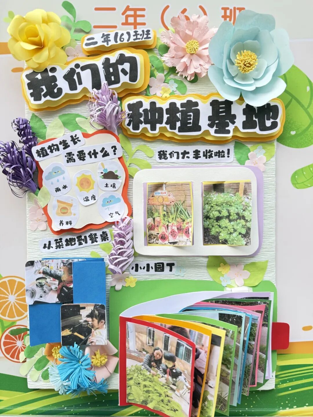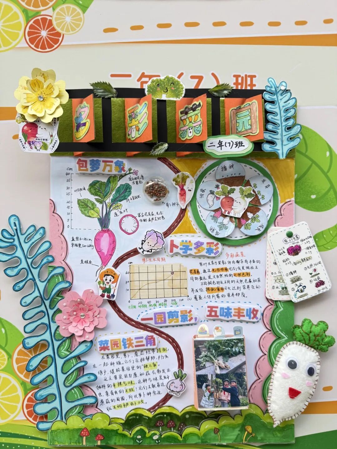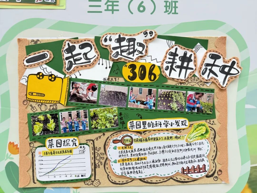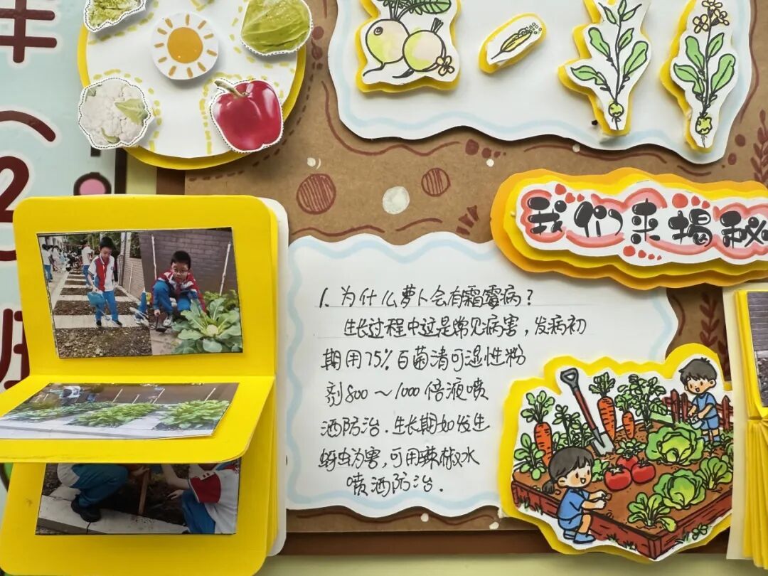 展区布置同样创意十足,科学探究与艺术气息巧妙融合。立体翻页册里,田间劳作照片搭配手写的植物防治笔记,尽显探究的细致;卡纸蔬菜、毛绒萝卜手作鲜活可爱,生长曲线图清晰呈现各类蔬菜的生长规律。立体装饰定格播种到收获的全过程,用童趣艺术让田间知识生动易懂,满溢孩子们的劳动成就感。