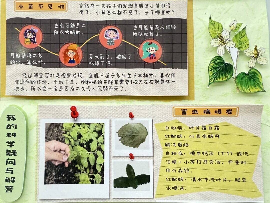 专属板块“我的科学疑问与解答”更是亮点十足,“为什么浇水太多会烂根”“植物为何会向光生长”,一个个充满童趣的科学疑问,搭配师生共同查阅资料、动手实验的验证过程,将科学课的探究思维融入劳动实践,让劳动不止于动手,更在于动脑。