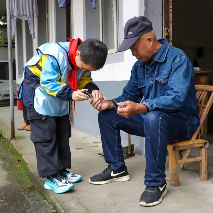 表演结束后,温暖仍在延续。在家长的耐心指导下,队员们轻轻走到老人身边,有的蹲下身帮老人剪指甲,动作小心翼翼;有的站在老人身后,温柔地为他们捶捶背、揉揉肩。老人们脸上露出了欣慰的笑容,时不时摸摸孩子们的头,轻声说着 “谢谢”,简单的互动里,满是跨越代际的温情。