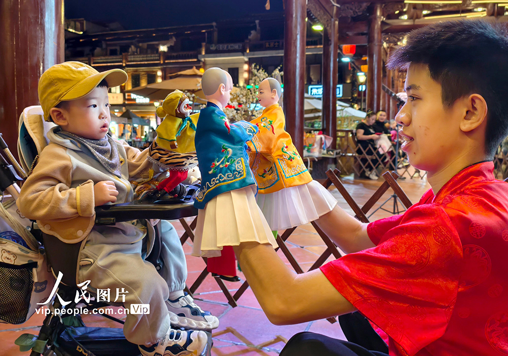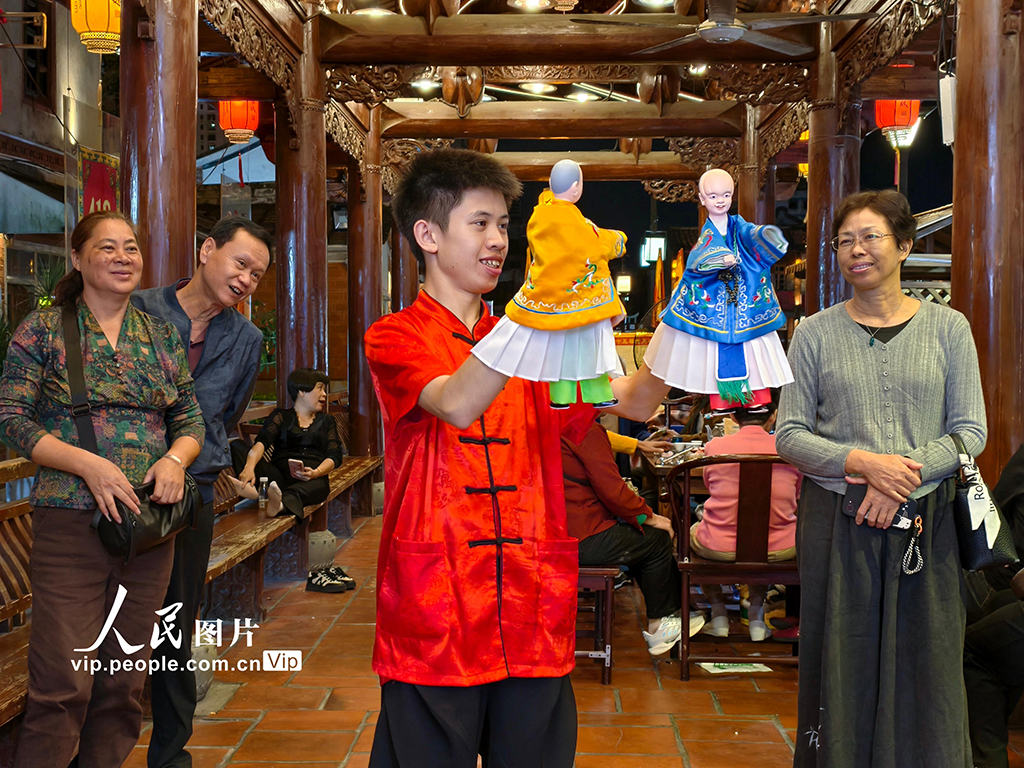 2025年11月13日夜,福建漳州古城内,一位年轻艺人在长廊的方寸戏台上指掌翻飞,活灵活现地表演布袋木偶戏,引得游客纷纷驻足喝彩。 近年来,漳州市将特有的布袋木偶艺术作为古城夜经济的亮点,组织街头表演,既留住了游客的脚步,又带动了周边餐饮、文创和民宿消费,让千年文化在烟火气中焕发新生。胡学军摄(人民图片网)
