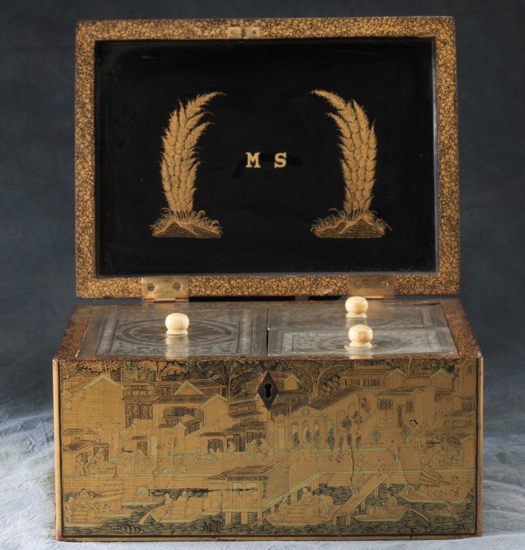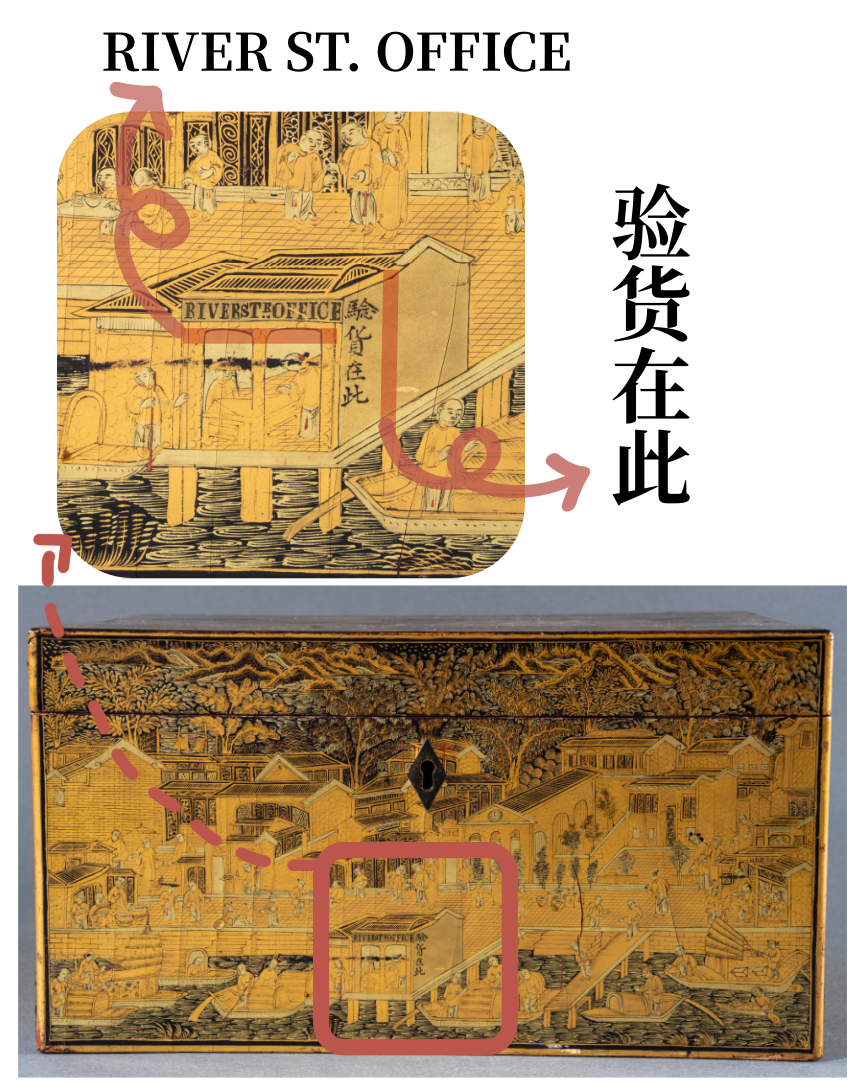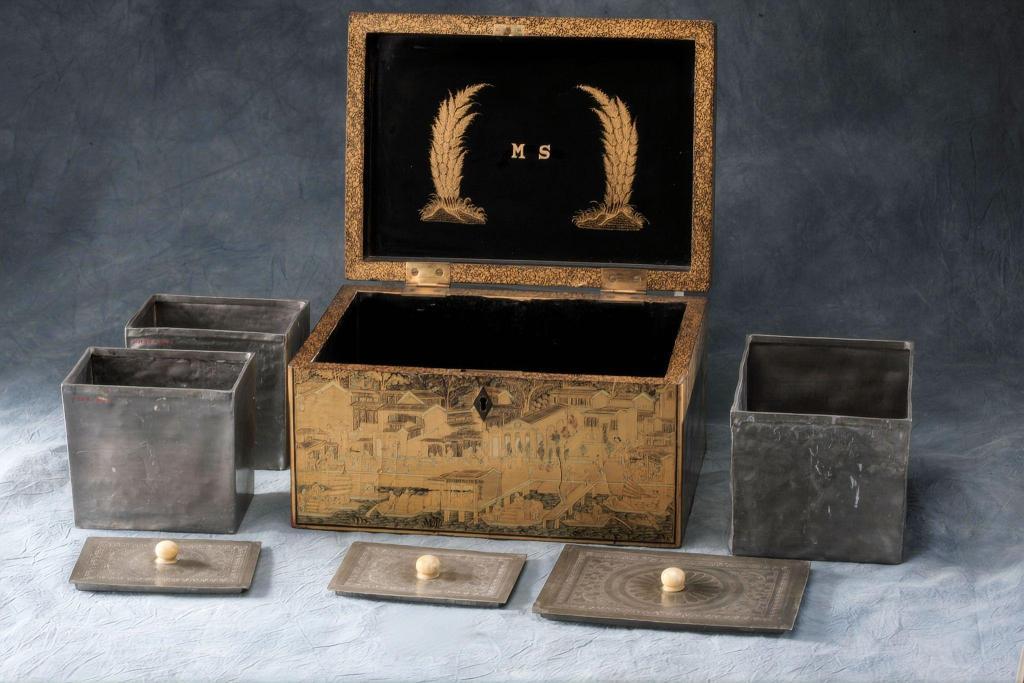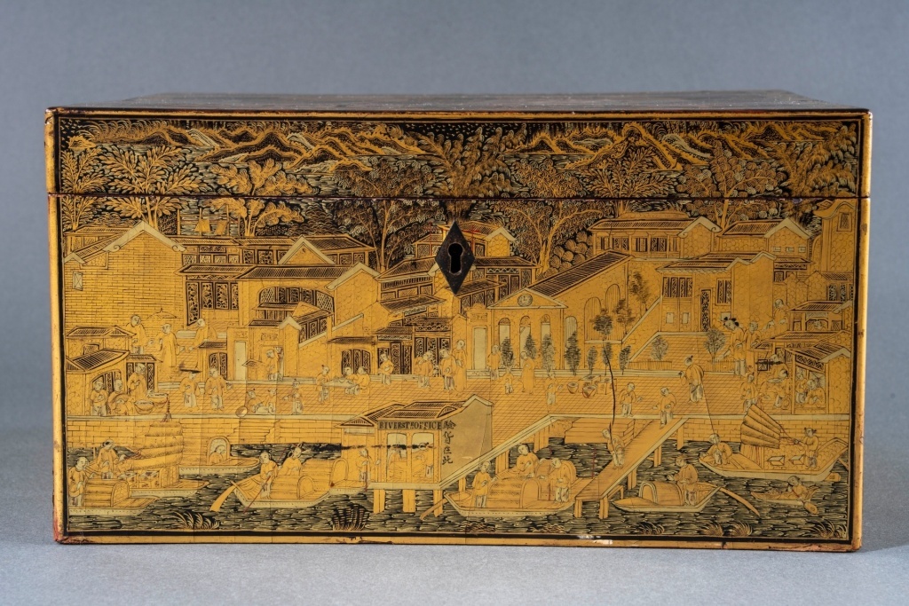 文物名称:黑漆描金“验货在此”验茶图茶叶盒