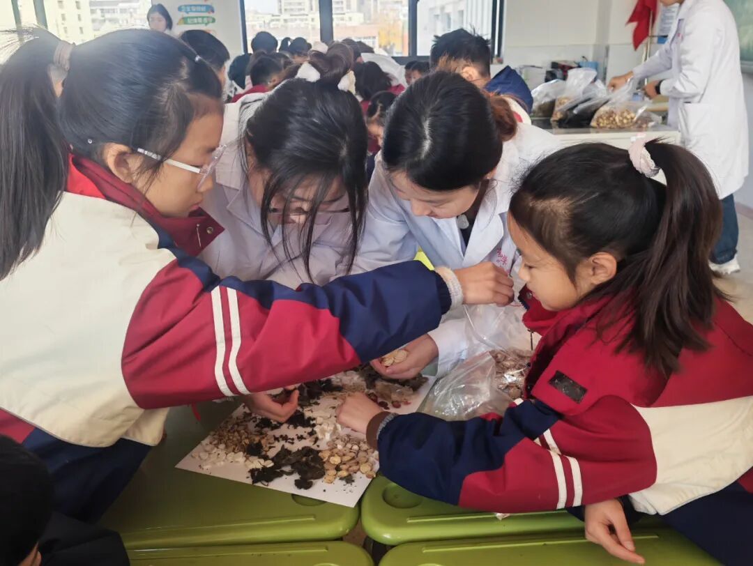 几名校外辅导员将二十味生活中常见的药材一一展示,为队员们带来一场“可触可闻”的本草启蒙。他们一边讲解药材在生活中的妙用,一边引导大家观察辨别。队员们兴致盎然地凑近中草药,指尖轻触根茎、鼻尖细嗅清香,专注地聆听辅导员讲解每一味药材的性味与功效。
