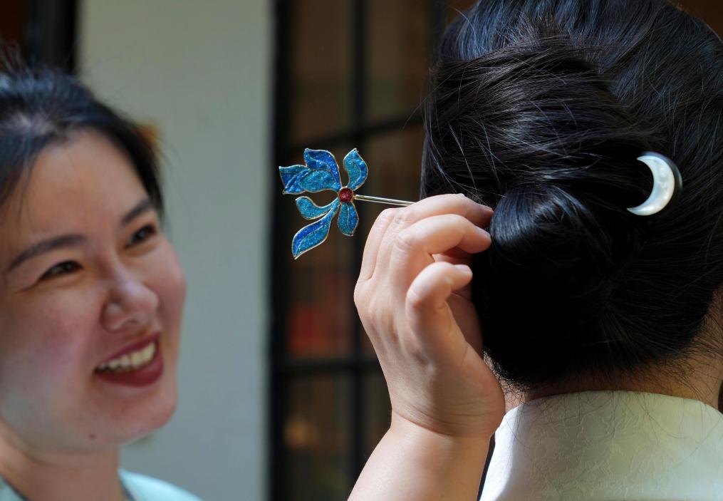 2025年4月18日,在上海市徐汇区淮海中路上的“瑾坤心舍”国风手作小店内,创始人李雯帮同事佩戴烧蓝头饰。