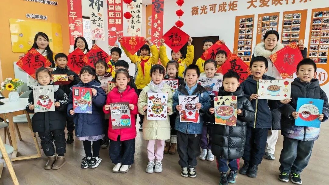 一年级的同学们化身“暖心设计师”,与家人一同创作“腊八暖心卡”,他们用画笔和彩纸描绘出温暖的粥碗与可爱的笑脸,并认真写下“腊八安康”等真挚祝福。