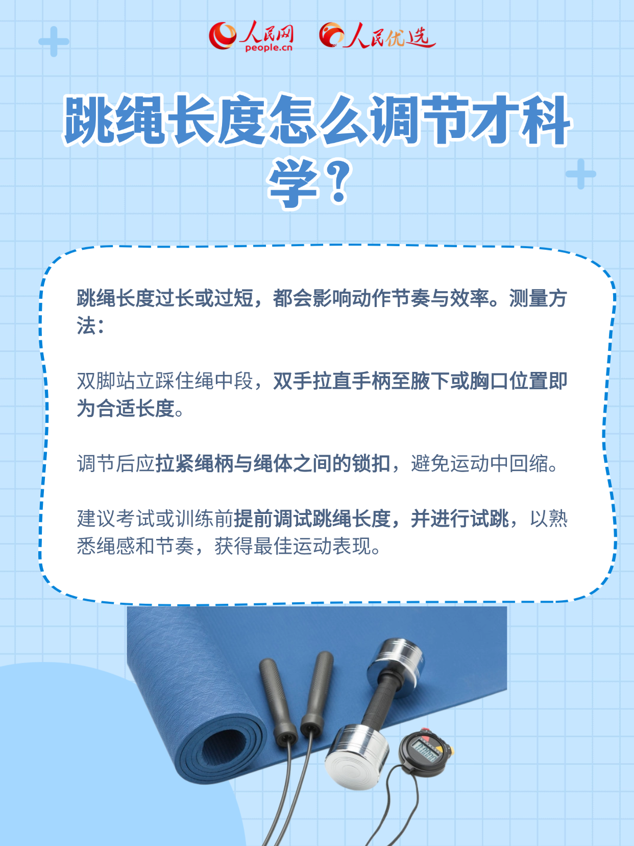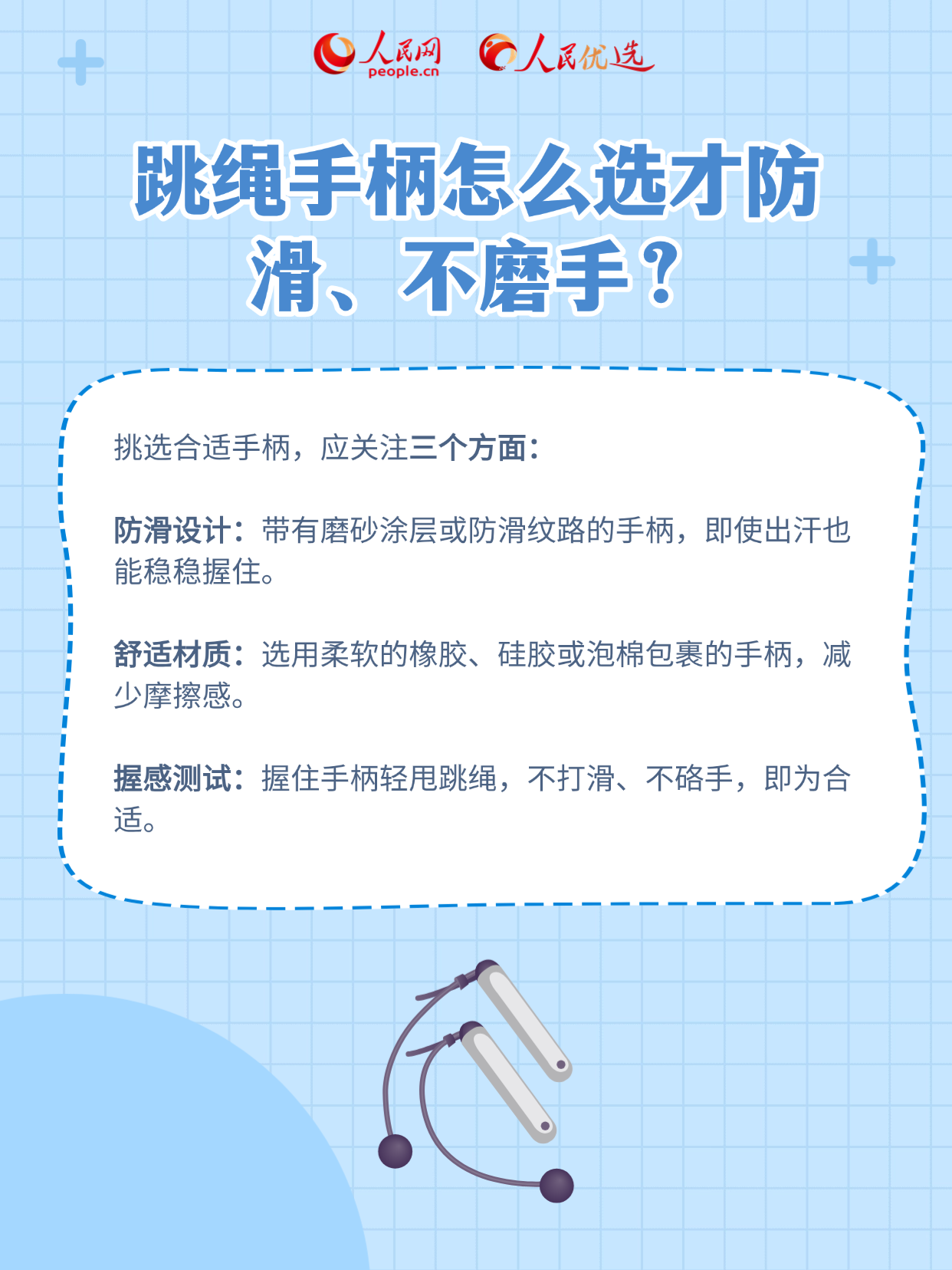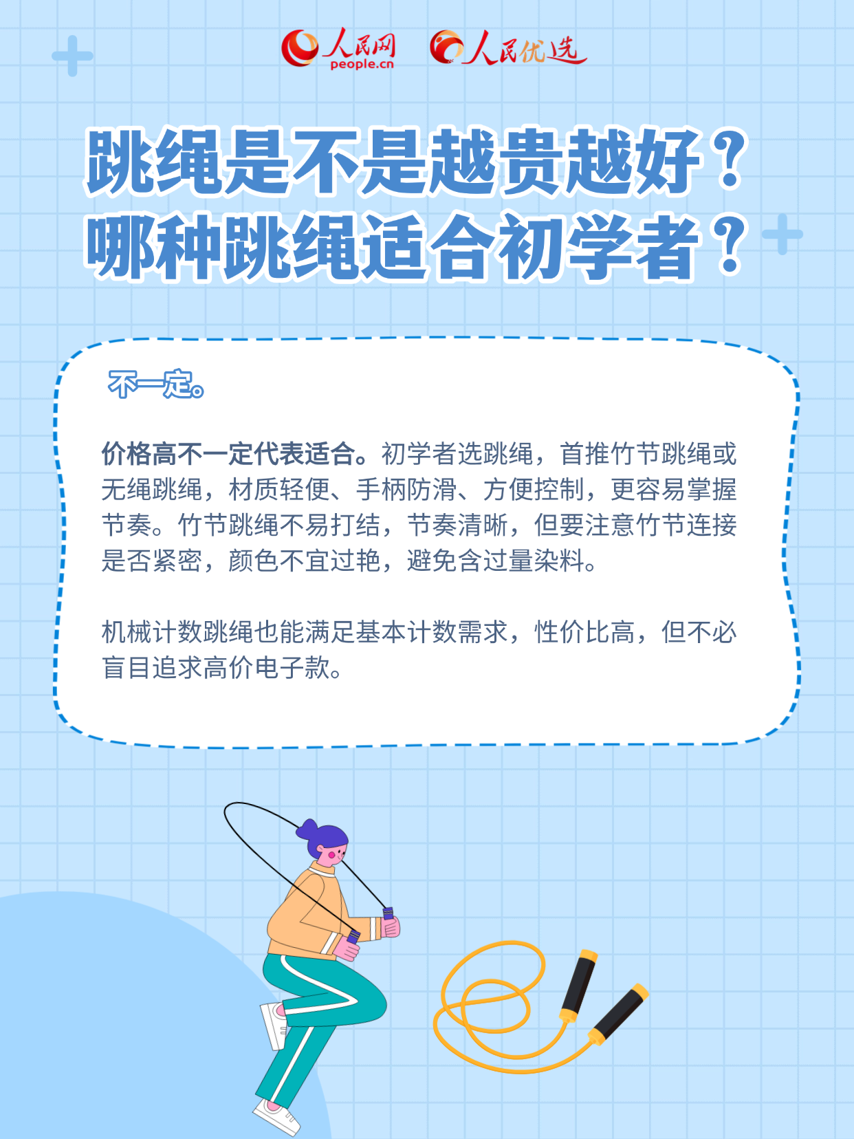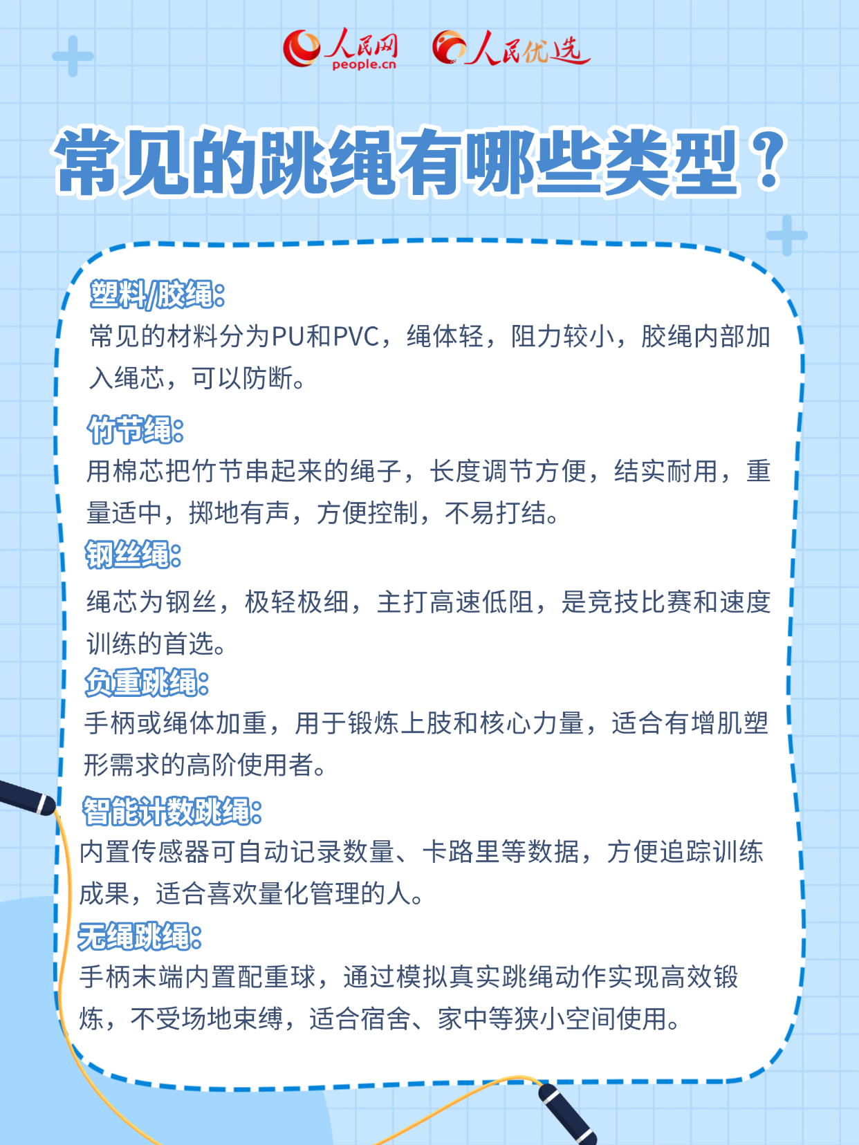 本期《人民优选来了》带来一份科学选购跳绳指南,帮你科学认知跳绳,并从材质、功能到使用场景全面掌握挑选技巧,跳得更安心、更轻松!