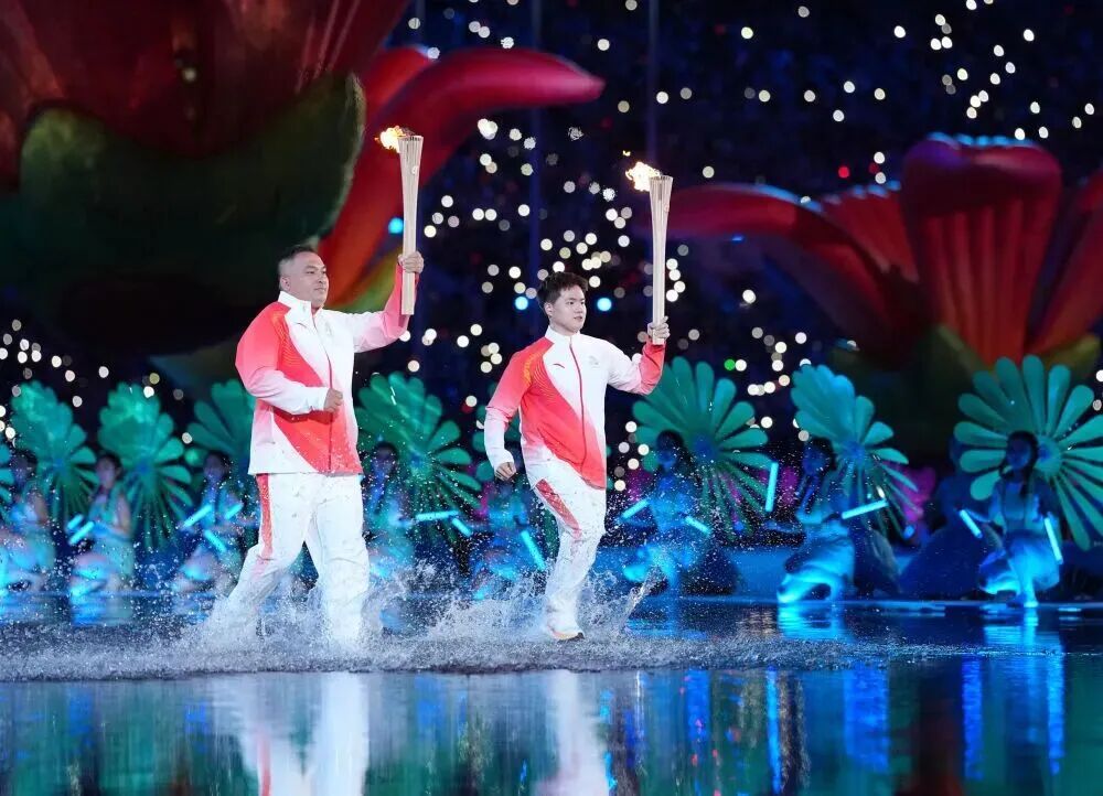 11月9日,火炬手赖宣治(左)、梁伟铿传递火炬。当日,第十五届全国运动会开幕式在广东奥林匹克体育中心举行。新华社记者 吴鲁 摄