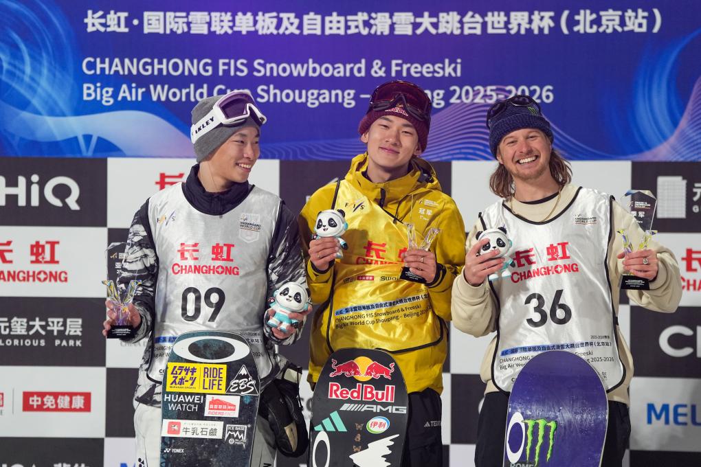 12月6日,冠军中国选手苏翊鸣(中)、亚军日本选手木村葵来(左)和季军芬兰选手雷内·林内康加斯在颁奖仪式上。新华社记者 鞠焕宗 摄