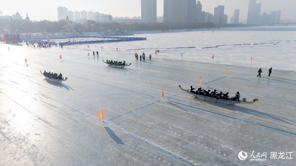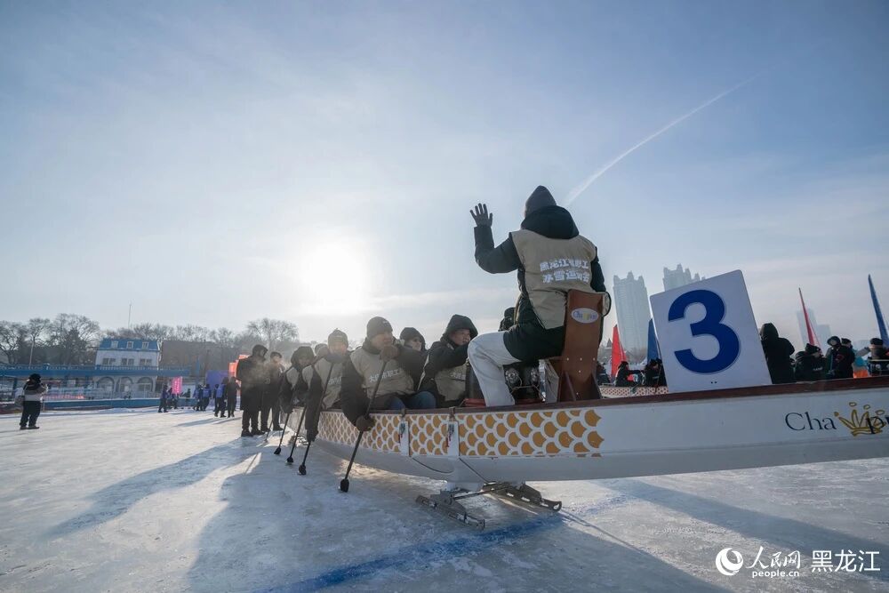冰上龙舟的队员们攥紧船桨、喊响号子