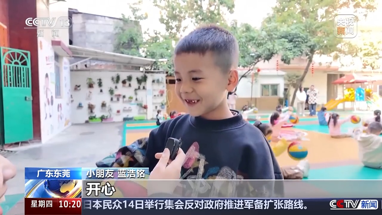东莞大朗巷尾新苗幼儿园老师 何彩婷:当时看到他们掉球了,我心里也挺紧张的,后来没想到他们变换队形的时候,小朋友一脚就把球踢回去给他了,那时候也挺暖心,挺开心的。
