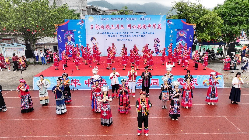 中国教育报-中国教育新闻网讯(记者 周仕敏 通讯员 谭凯兴)4月15日,广西柳州市融安县实验小学开展主题为“乡韵欢歌三月三 同心共绘中华篇”2026年“广西三月三”民俗传承活动,通过开展跳竹竿舞、唱山歌、民族服饰秀、民俗知识问答等,开展沉浸式、趣味性的民俗体验与文化展示活动,让学生近距离感受家乡文化魅力,传承中华优秀传统文化,激发师生爱家乡、爱民族、爱祖国的真挚情感。