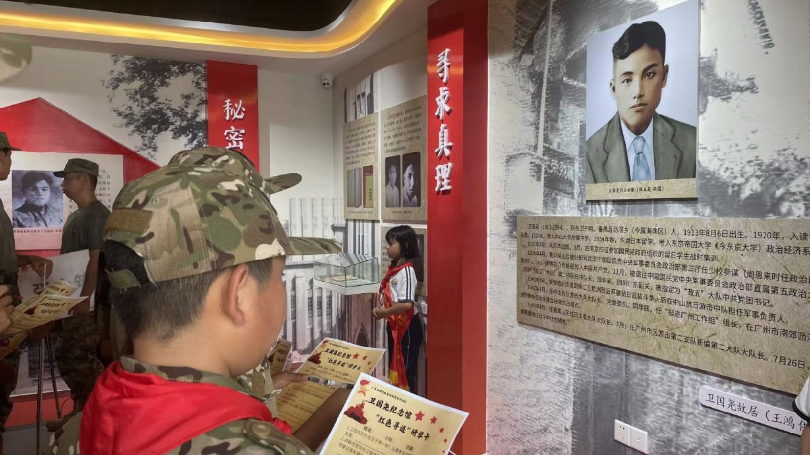 “原来英雄的钢笔这么朴素!”广州市海珠区华洲实验学校五年级的胡雨萌同学在展柜前驻足良久——那里陈列着卫国尧烈士生前使用的钢笔,笔身磨损严重,笔尖却依旧光亮。她一边在研学卡片上写下“1938年,卫国尧用这支笔起草抗日宣传稿”,一边抬头追问讲解员:“烈士写稿时,会不会担心被敌人发现?”得到“他把对国家的热爱,藏在每一个字里”的回答后,胡雨萌郑重地在“强军梦想”栏写下:“我要像烈士一样,用知识做‘武器’,长大后保护祖国。”