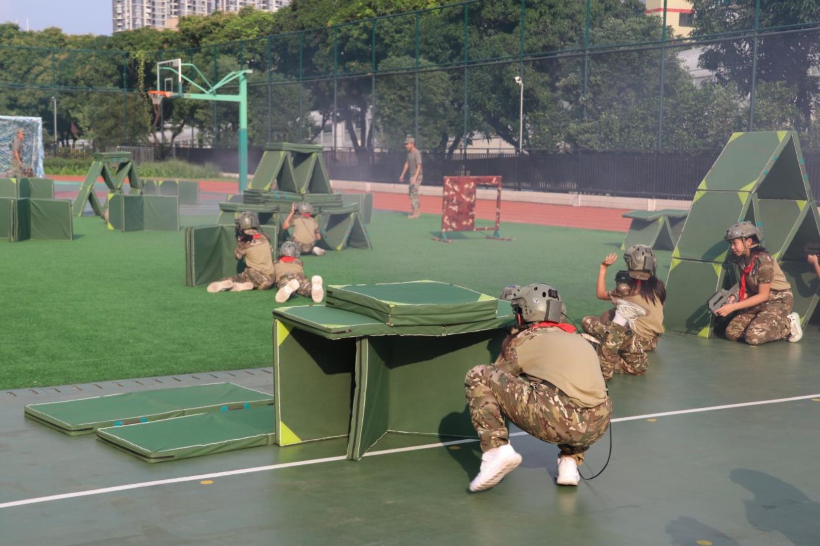 “各就位,预备——开始!”哨声响起,下午3时,军事体育障碍赛在广州市南武中学附属学校操场拉开帷幕,这是本次训练营最受期待的环节之一。队员们被分为三个小组,围绕“跨越矮墙”“钻网洞”“红蓝军对抗赛”等项目展开激烈比拼,赛场上传来阵阵加油呐喊声。