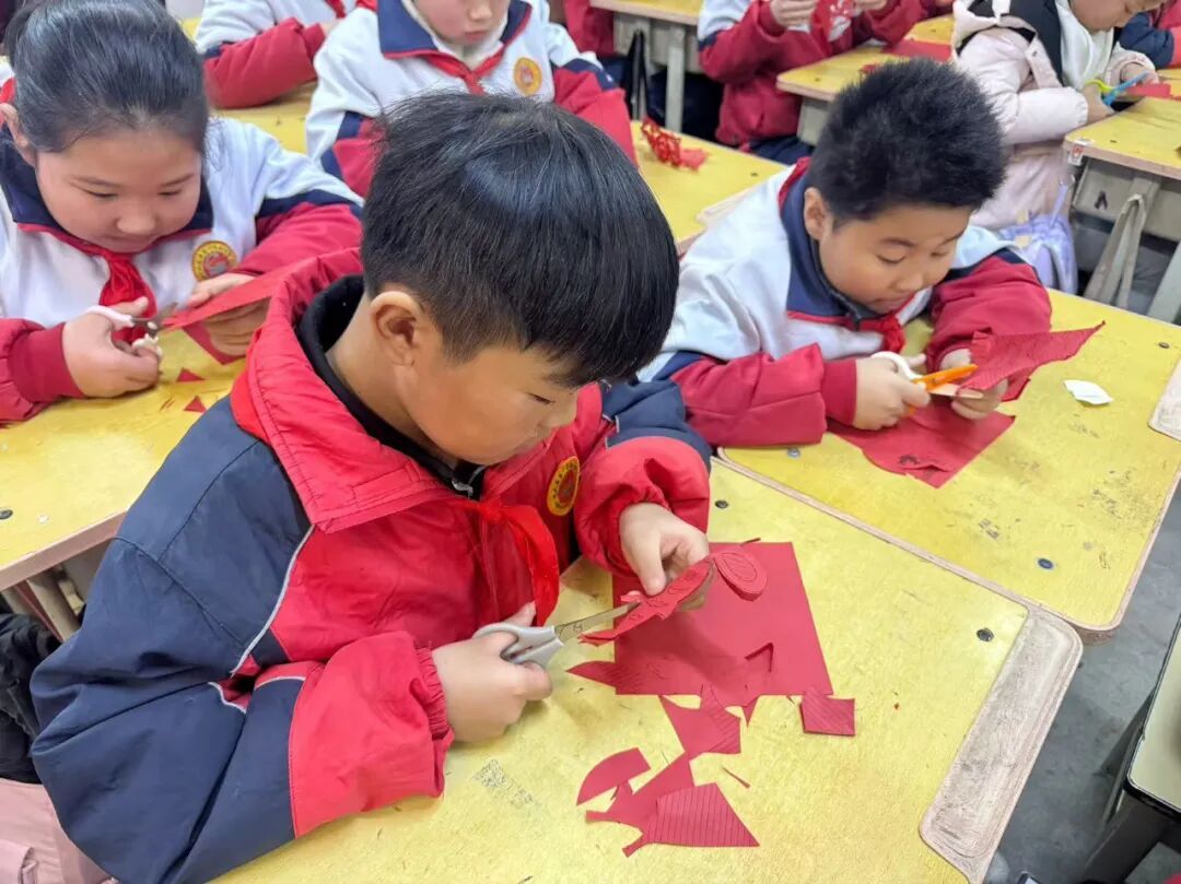 教室里也变成了热闹的手工小作坊。在辅导员的指导下,少先队员们化身“手工小达人”,开启了剪窗花之旅。灵动的蝴蝶、憨态可掬的小猪、吉祥的福字、喜庆的窗花……每一件作品都充满了童真与巧思。