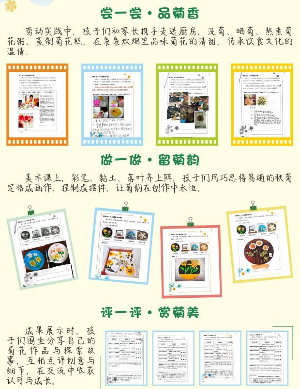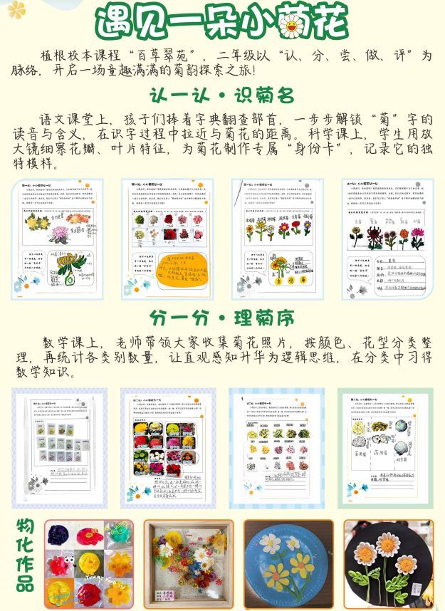 二年级的探索以一朵小菊花为起点,队员们循着“认、分、尝、做、评”的脉络,将识字、观察、分类、创作等多种能力融入其中,从认菊字、察菊态到品菊味、留菊韵,在完整的探索链条中,读懂自然与文化之美。