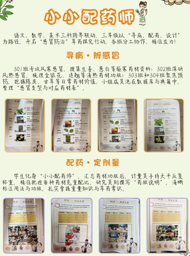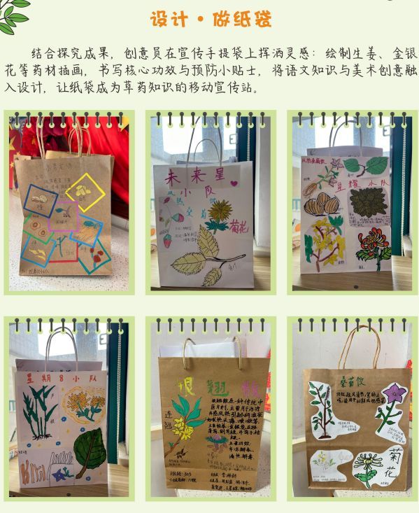 三年级队员化身专业小药师,聚焦“感冒防治”开启探秘!他们在实践中同步锤炼多种能力:梳理药材功效时锻炼整理归纳能力,精准配比药材时运用计量知识,设计宣传手提袋时释放美术创意。分工协作间,草药知识与综合能力实现双重提升!