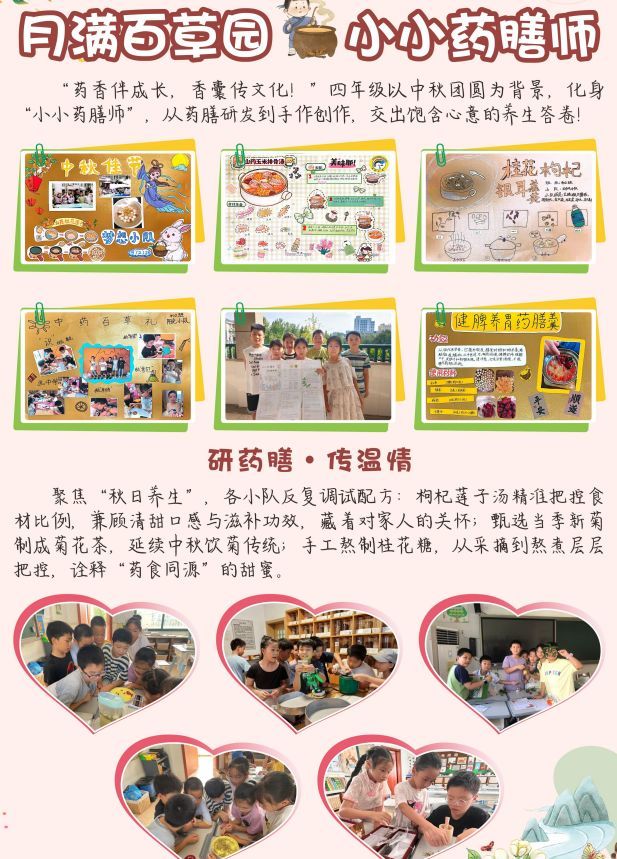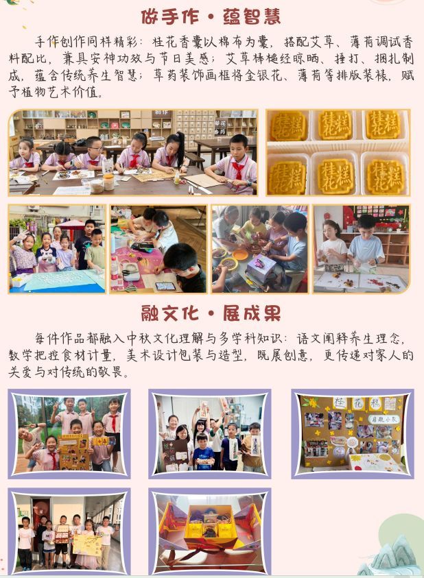 四年级将多学科知识融入药膳创作,围绕秋日养生主题,研发出枸杞莲子汤、菊花茶等暖心药膳,也制作出桂花香囊等精致手作。每一件作品都藏着对家人的关爱,更体现了知识的跨界应用价值。