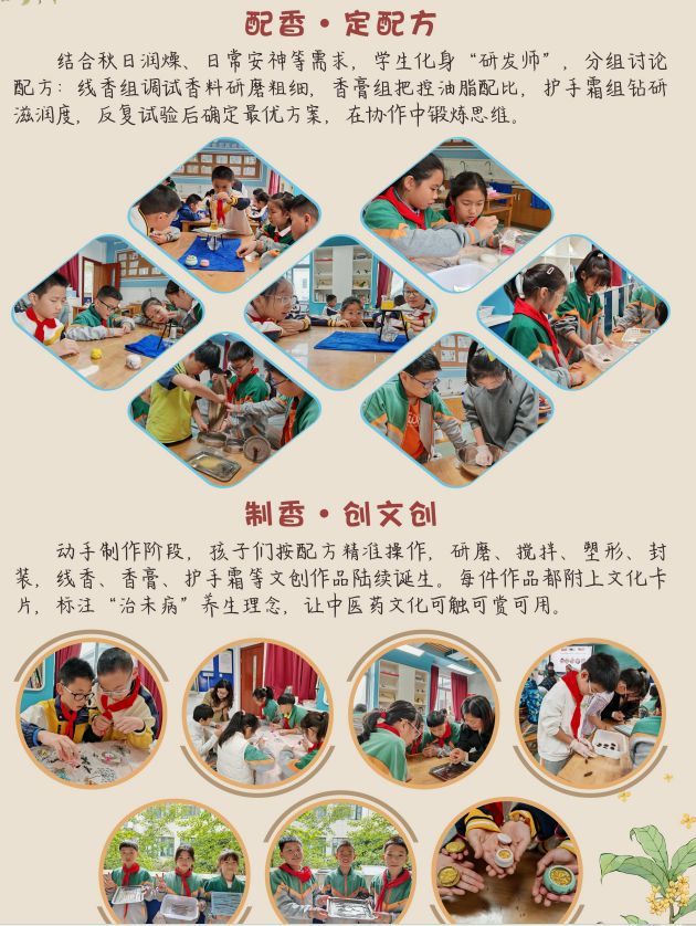 五年级以市花桂花为核心,开启跨学科制香探索!队员们先在自然中感知桂香、探寻其药用与文化价值,再分组调试线香、香膏配方,最后制作文创作品。整个过程中,感官体验、科学思维与文化认知相互赋能,让中医药魅力可触可闻可感。