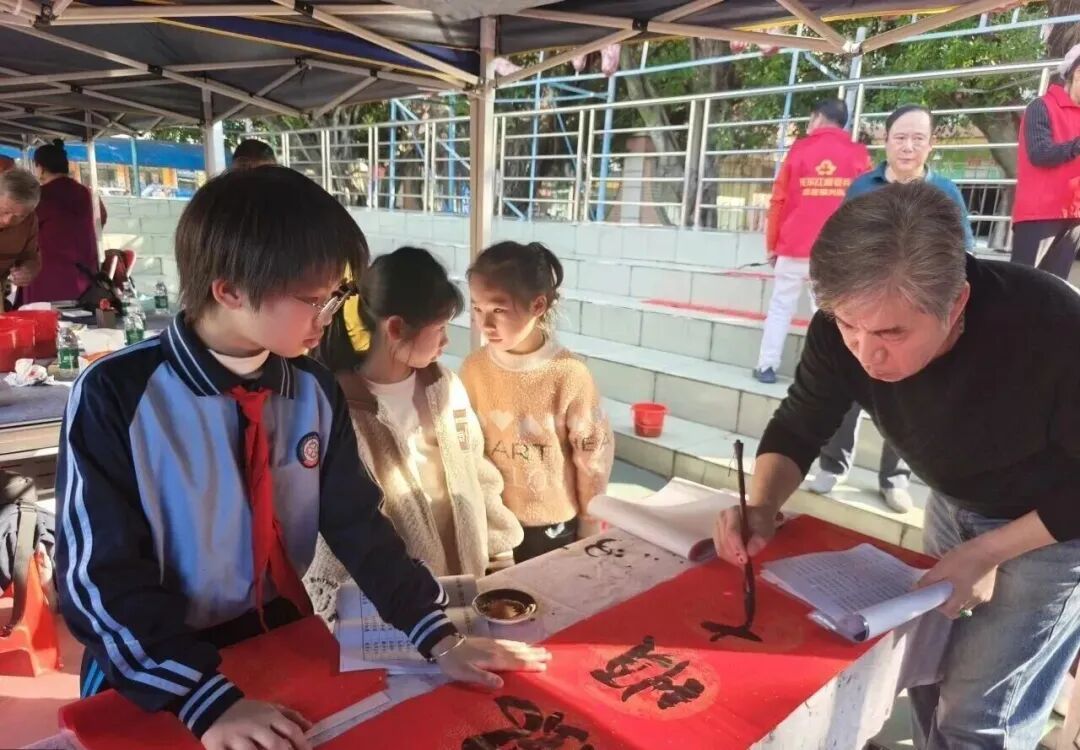 书法观摩体验区人气最旺,20余名书画名家现场挥毫泼墨,一幅幅寓意吉祥的春联、一个个苍劲有力的福字跃然纸上。队员们围在桌前,屏息凝神地观察名家运笔,一边感受书法艺术的独特韵味,一边加入志愿者的服务队伍中帮忙整理年画、春联。