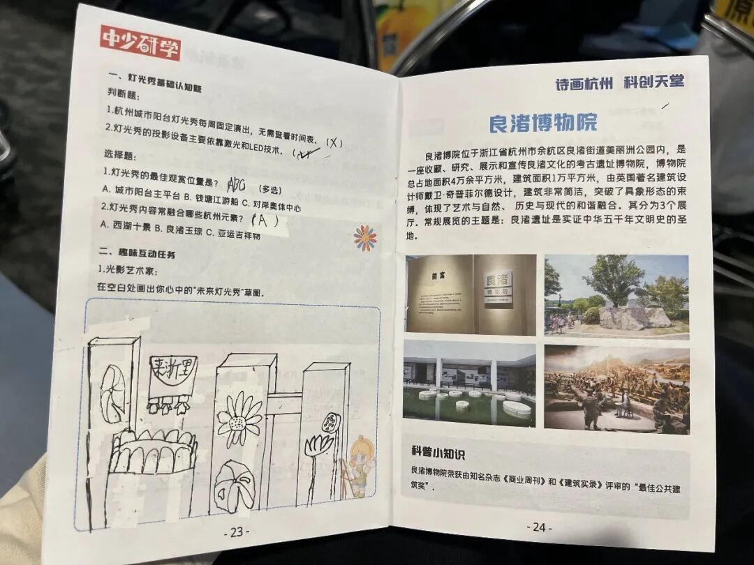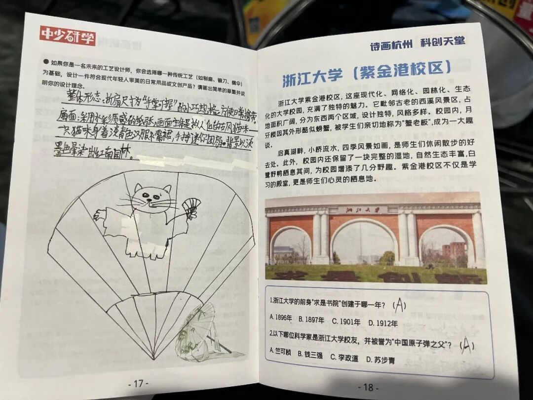 翻开小伙伴们的研学手册,每页都写满了收获。在手册最后一页,有的小伙伴画了个大大的笑脸,旁边写着:“向往西湖,感受到了知识的温度,技术发明的终点是服务生活,我希望能用眼睛看、用手触摸,让历史和科技帮助我一起长大,探索更多的奇妙。”