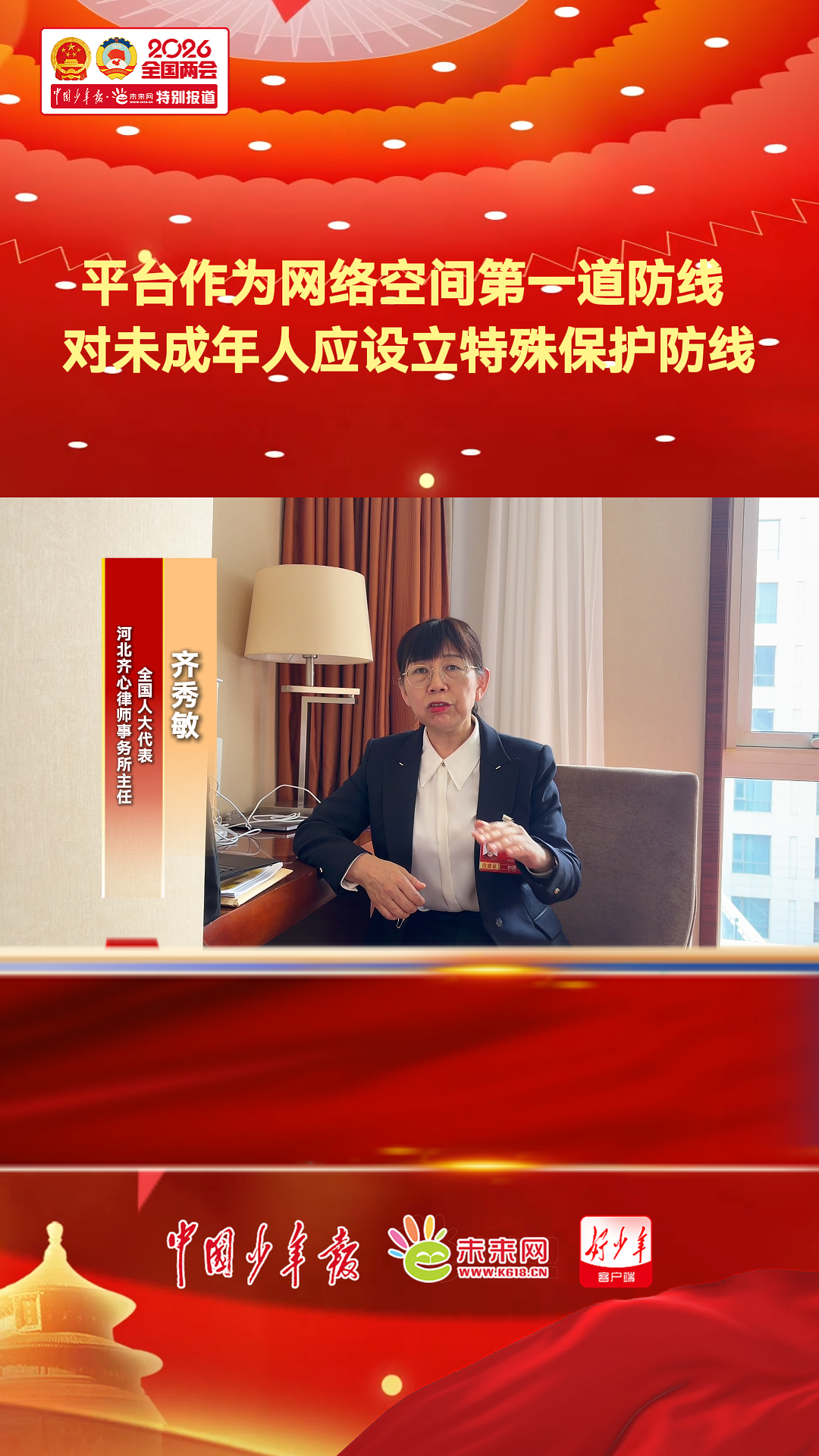 全国人大代表、河北齐心律师事务所主任齐秀敏接受中国少年报·未来网记者专访,谈筑牢未成年人网络隐私保护防线。