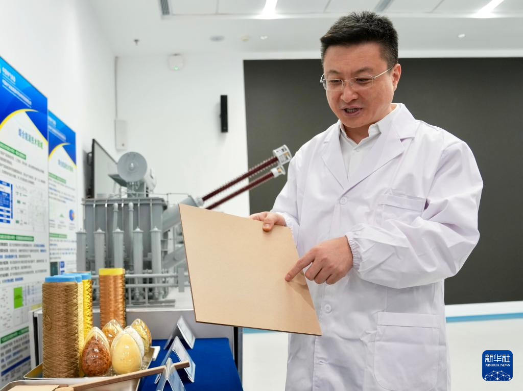1月27日,在中国电气装备集团上海科研基地,张帆在介绍特高压变压器的关键材料绝缘纸板。绝缘纸板原材料长期被国外巨头垄断。张帆带领团队运用AI技术推进国产化替代,攻克“卡脖子”难题。