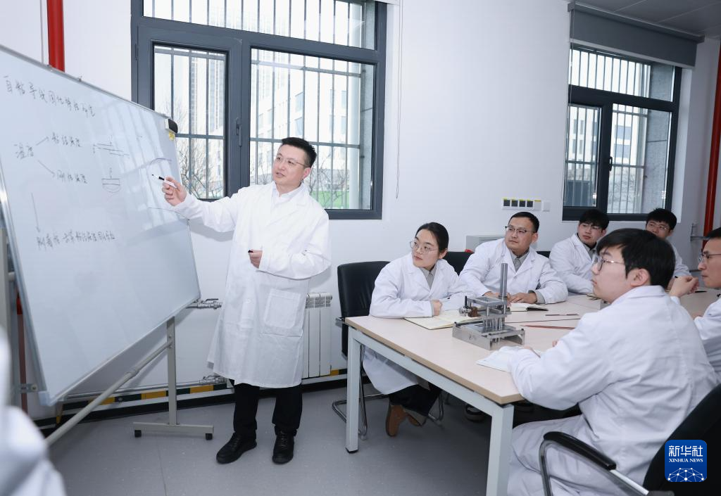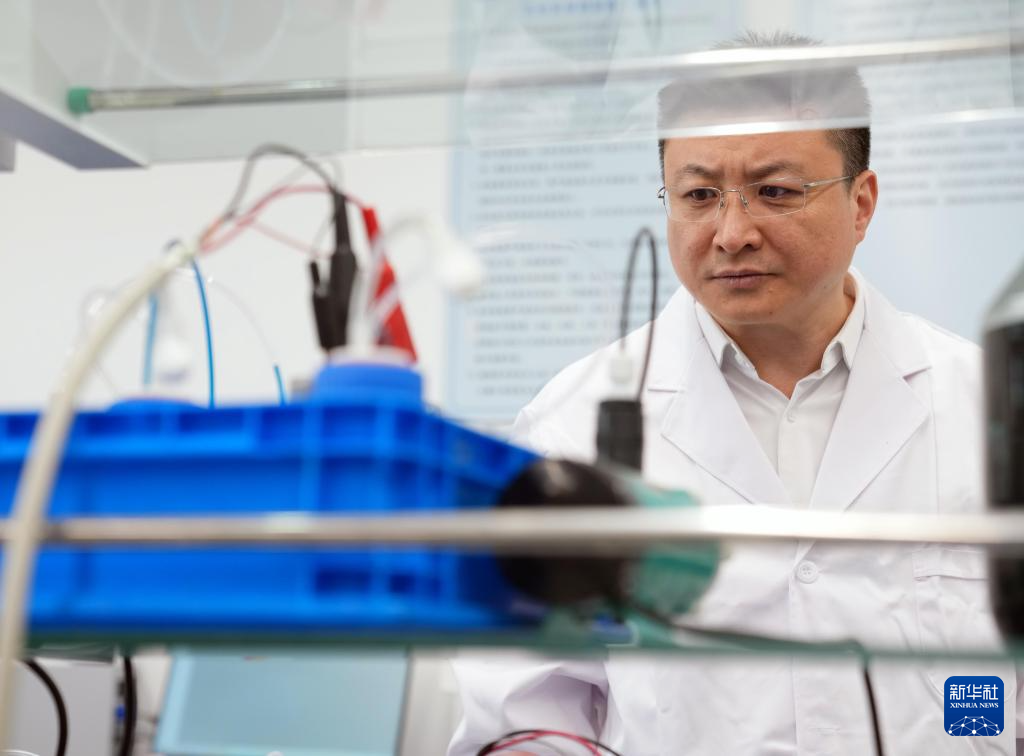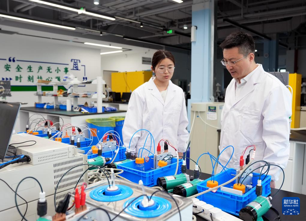 1月27日,在中国电气装备集团上海科研基地,张帆(右)在调研液流电池实验平台的研发情况。