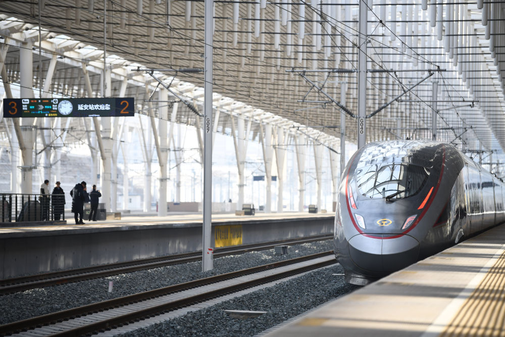 2025年12月26日,西安至延安高铁开通运营。至此,中国高铁运营里程突破5万公里。这是西延高铁首发列车从延安站驶出。新华社记者 张博文 摄