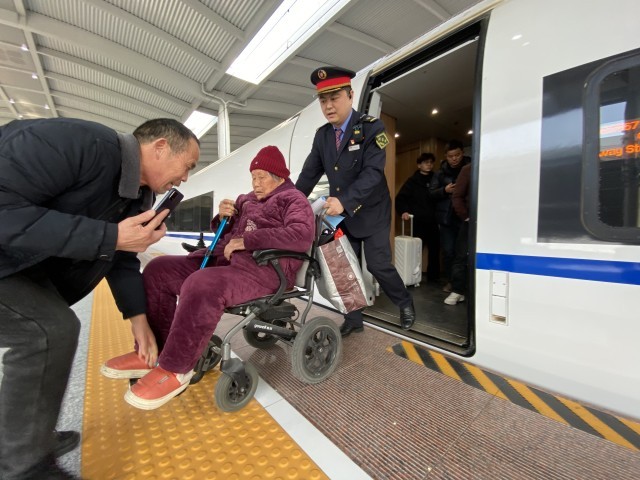 2月2日,G3367次列车经停合肥西站,列车长陈科帮助重点旅客下车。郭笑丞/摄