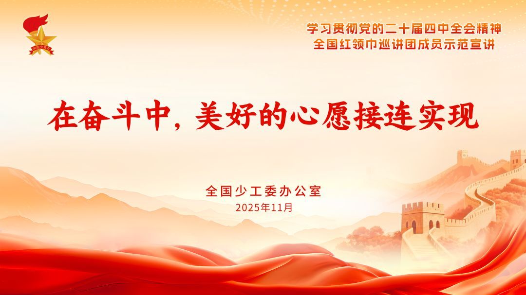 为深入学习宣传贯彻党的二十届四中全会精神,近期,全国少工委办公室组织全国红领巾巡讲团骨干进行了集体备课,并先后前往多地开展宣讲,用“童言童语”讲好党的创新理论。为赋能基层,现推出全会精神示范宣讲稿(少先队员版)及课件,方便少先队辅导员、少先队工作者组织队课、宣讲等活动使用。