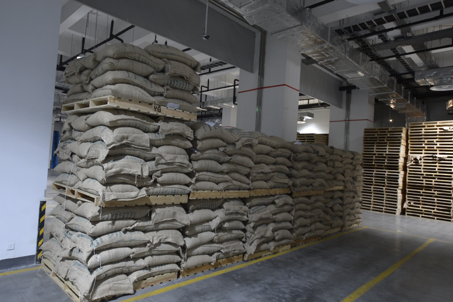 在分拨中心的巨大仓库内,来自埃塞俄比亚等30多个国家的咖啡生豆整齐码放,享受着恒温恒湿的舒适环境。