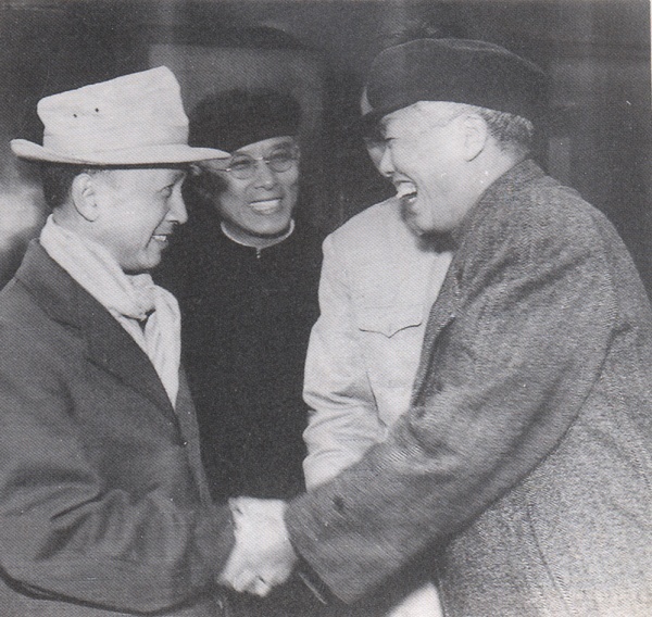 1955年10月28日,中国科学院副院长吴有训(右)等到北京火车站迎接钱学森。