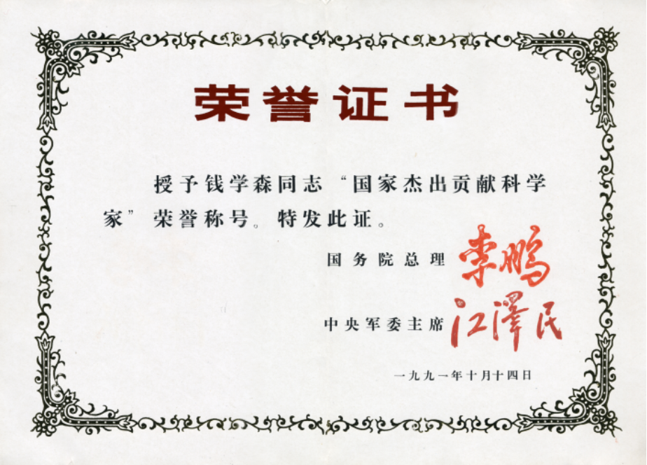 1991年10月14日,国务院、中央军委授予钱学森“国家杰出贡献科学家”荣誉称号,以表彰他全心全意为人民服务,为祖国科技事业的发展所做出的卓越贡献。