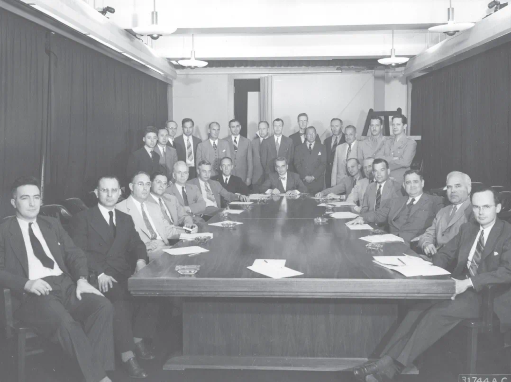 美国国防部科学咨询团成员合影(站立左二为钱学森,座位正中为冯•卡门)
