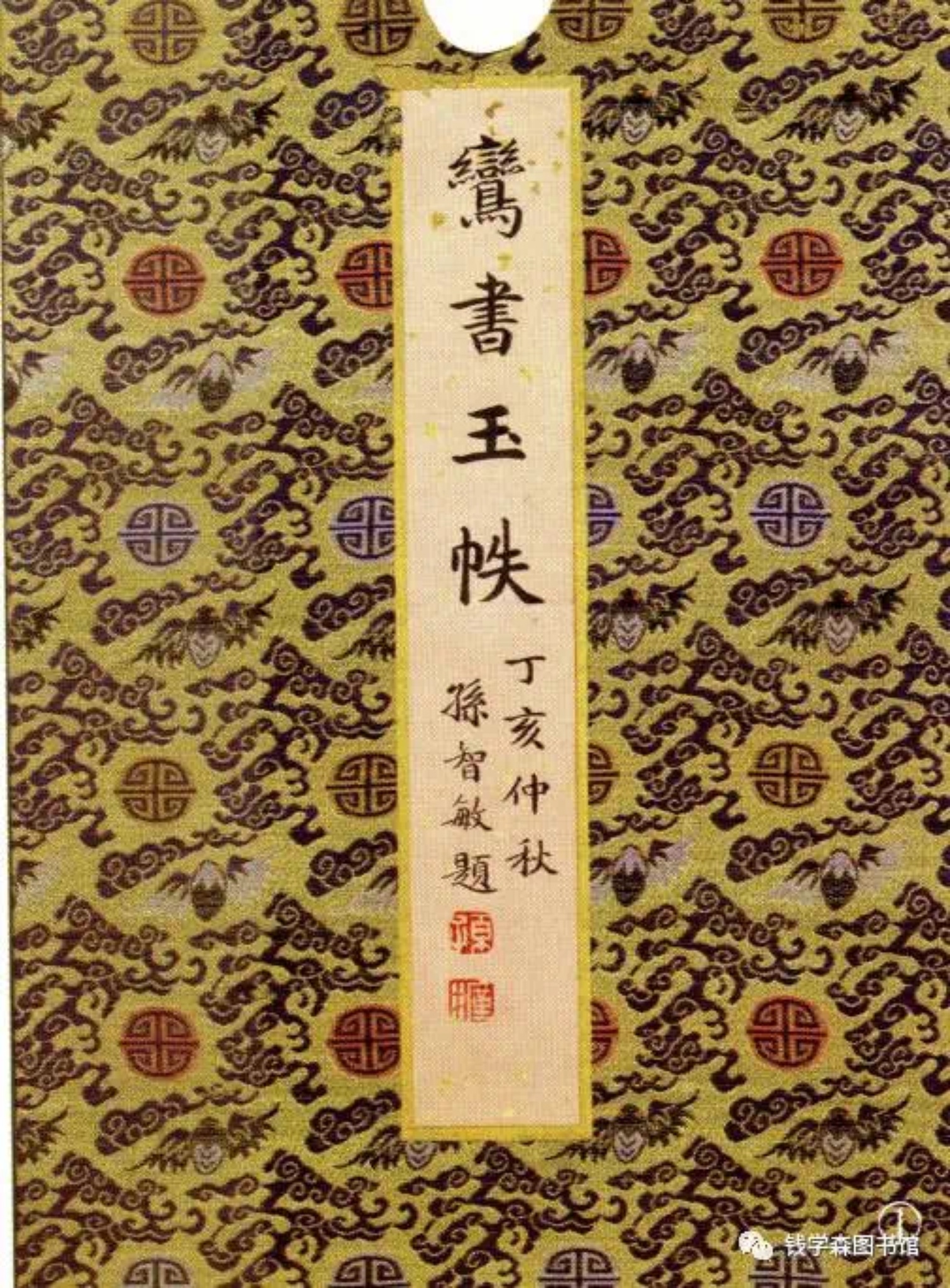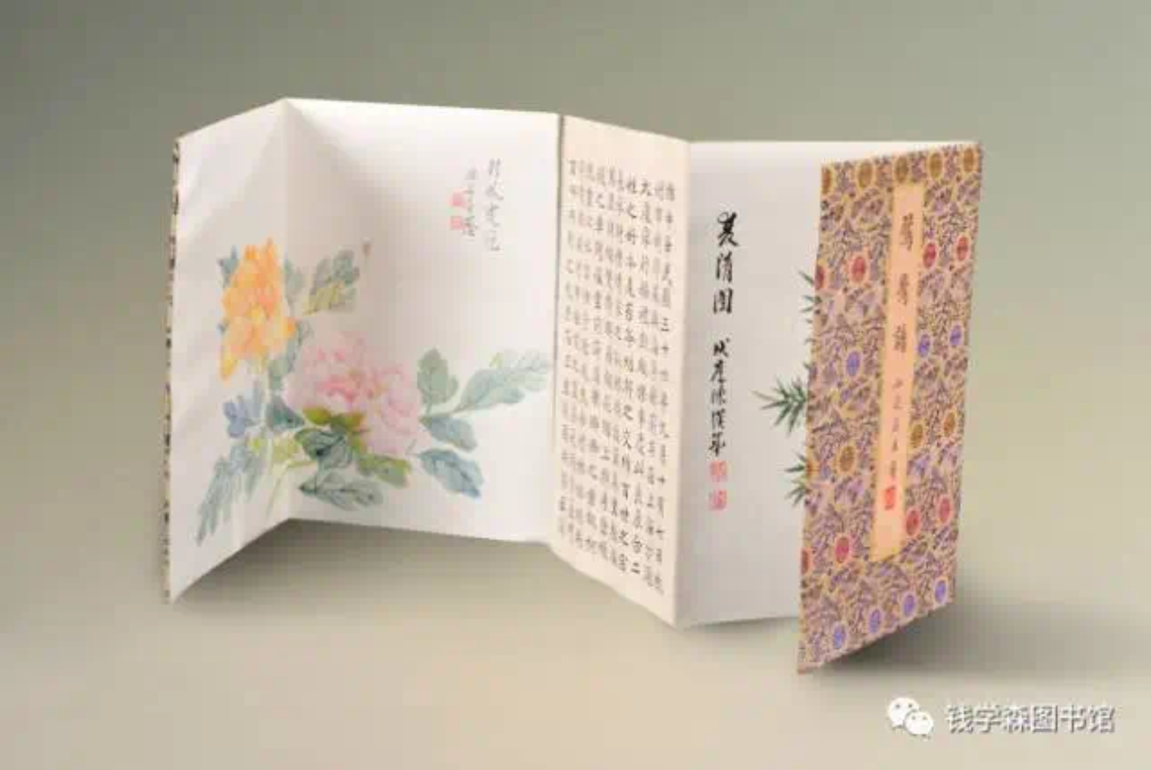 钱学森与蒋英的婚书名为“鸳鸯谱”,封面材料是绸缎材质,内页材质为宣纸,正文用娟秀的馆阁体书写,左右两侧配有国画。