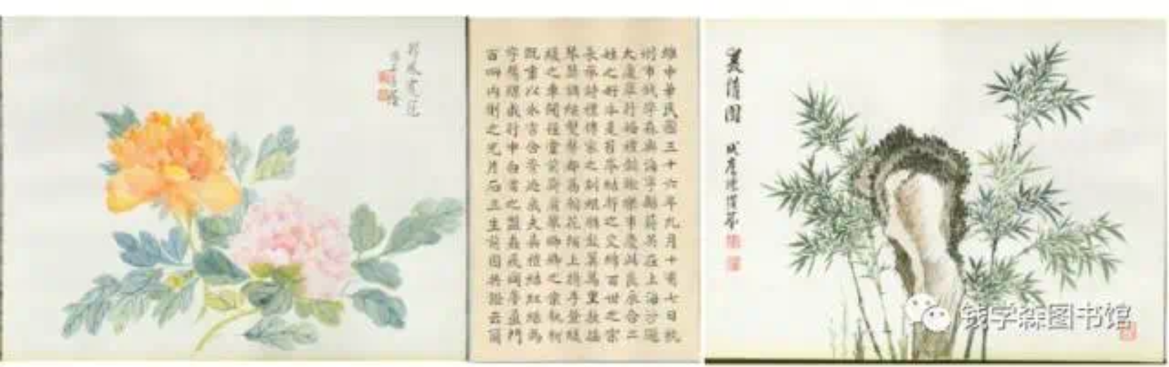 陈仲恕、陈叔通兄弟二人均爱好作画及收藏。早年他们共同参加西冷印社的老将、美术教育家姜丹书以及当时在画坛上正红的潘天寿组织的“莼社”,以酒会友,谈诗论画。陈仲恕还曾担任过中国画学研究会评议,著有《姜丹书稿》、《美术家年鉴》等。陈仲恕的妻子吴善荫,是民国时期著名的海派女书画家,夫妇二人联手为钱学森的婚书创作配图,足以见得对钱学森、蒋英这两位后辈的疼爱与祝福。陈仲恕画的是自己最擅长的竹,名为“夏清图”。竹向来是文人墨客赋诗作画的素材,既可以表达自己的傲骨风霜,同样也象征着生命的弹性和精神的真理。陈仲恕通过此画既表达了自己虚心亮节、潇洒挺拔的气度,又寄语钱学森要像竹一样有君子之风。从此画中也能看出陈仲恕笔墨严谨,极有法度而仍生动有致。其妻吴善荫所画的是象征吉祥如意的百花之王牡丹,寓意对新婚夫妇美满婚姻的衷心祝福。