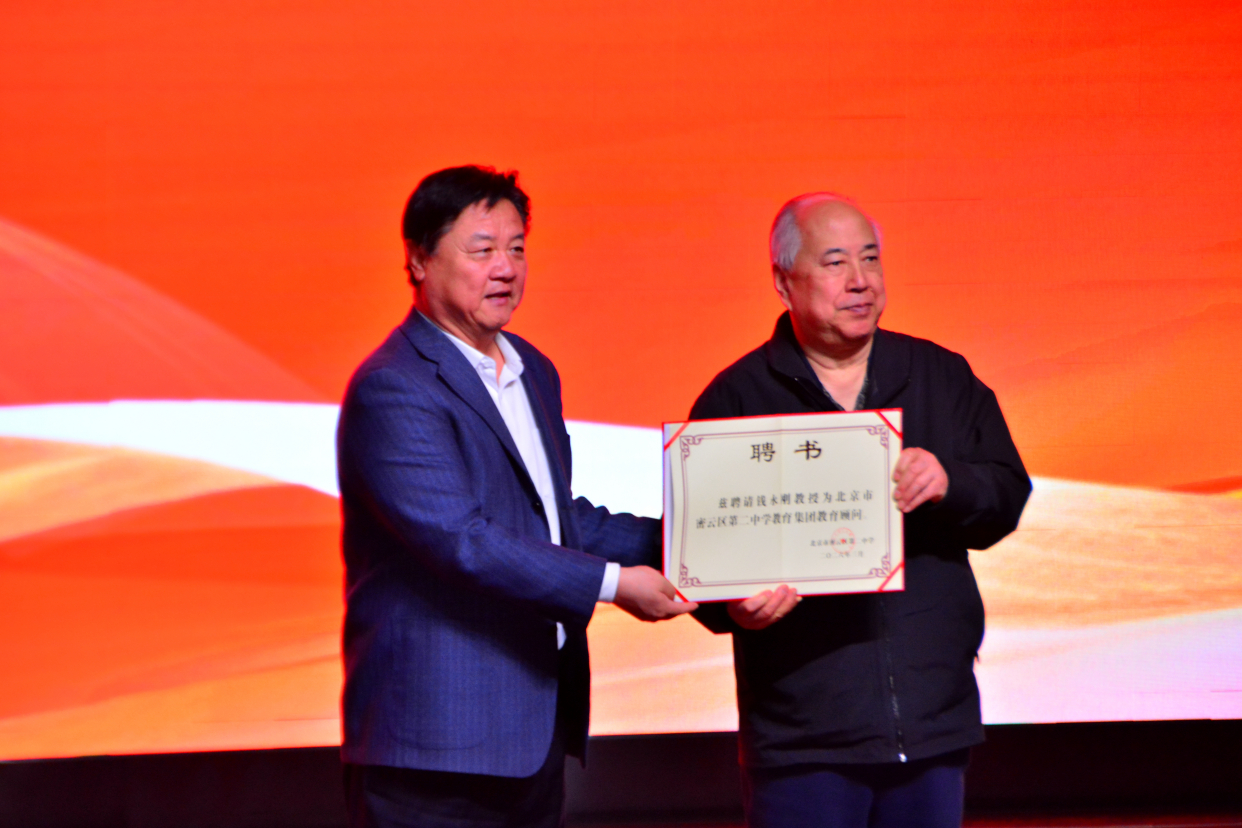 活动现场,上海交通大学钱学森图书馆馆长、钱学森教育工作委员会主任委员钱永刚教授宣读密云二中“钱学森班”批复文件,并正式为学校授牌。钱学森教育工作委员会、中国航天科技集团领导、专家,密云区人民政府,密云区委教育工委、区教委以及密云二中教育集团师生代表共同见证这一重要时刻。密云区教委主任杨福军向钱永刚教授颁发密云二中教育集团教育顾问聘书。钱学森教育工作委员会副秘书长鲁鸣宣读孙家栋院士的贺信。贺信中,孙家栋院士殷切嘱托每一位学子:钱学森实验班为你们的科技探索搭建了更广阔的平台,未来这里将融合校园课堂,以航天科普让书本知识与科技探索深度结合,让钱学森大成智慧教育理念与学校止于至善的办学理念深度融合。他勉励学子在科学探索中练就过硬本领,为祖国的航天事业添砖加瓦,为中华民族伟大复兴贡献青春力量。